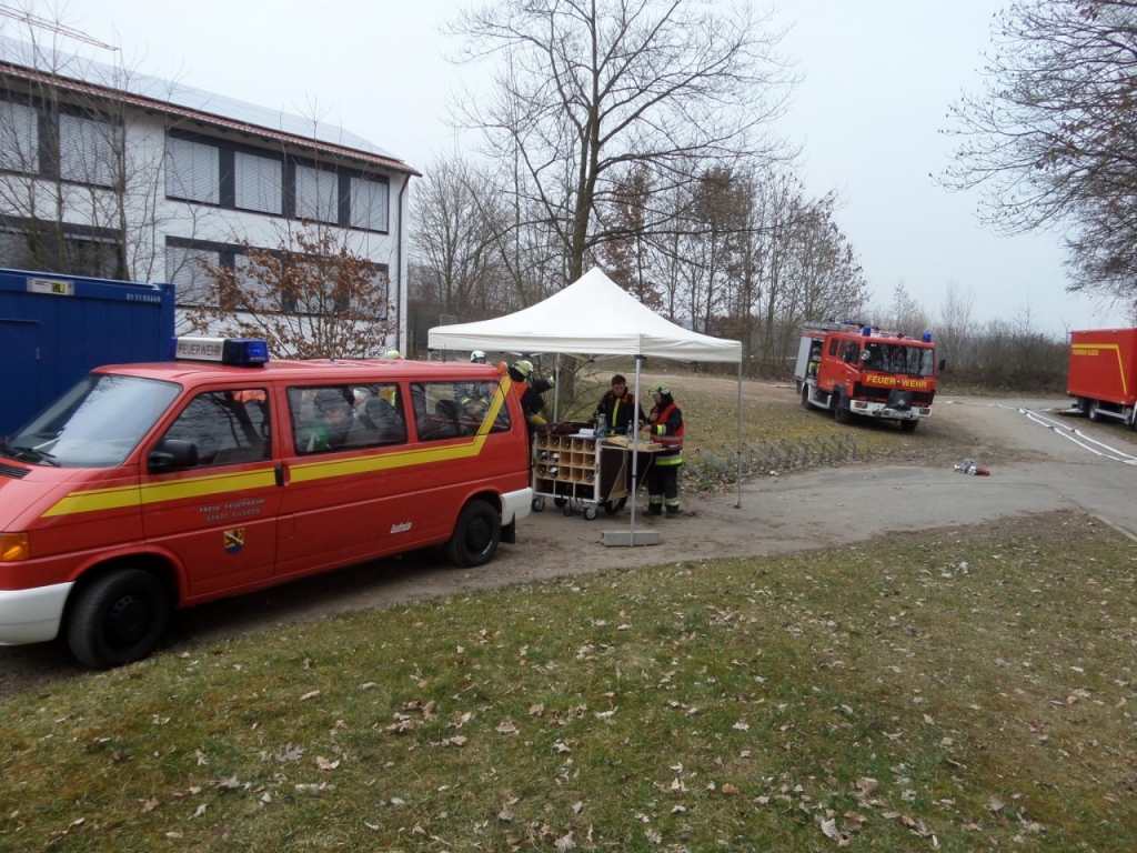 Zu Jahresbeginn erfolgt die gemeinsame Belehrung gemäß FwDV 7. Im Anschluss daran werden die Geräteträger in Gruppen zu je zwei Trupps für die praktischen