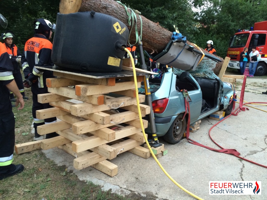 Ähnlich, wie auch bereits in der Übung zuvor, lag ein massiver Baumstamm auf einem PKW, in welchem sowohl Fahrer als auch Beifahrer in der Fahrgastzelle eingeklemmt waren. Jedoch bestand im Gegensatz zur vorangegangen Übung diesmal das Übungsziel, die Last größtmöglich anzuheben und die Personen anschließend zu retten.