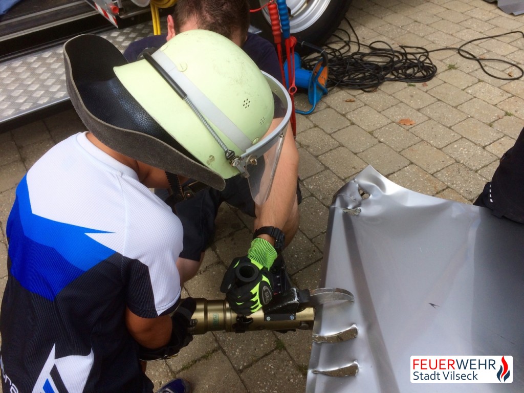 So konnten sie mit Rettungsschere und - Spreizer an einer Motorhaube schneiden und diese zusammendrücken, mit einem Feuerwehrschlauch auf ein Ziel löschen oder sogar damit kegeln.