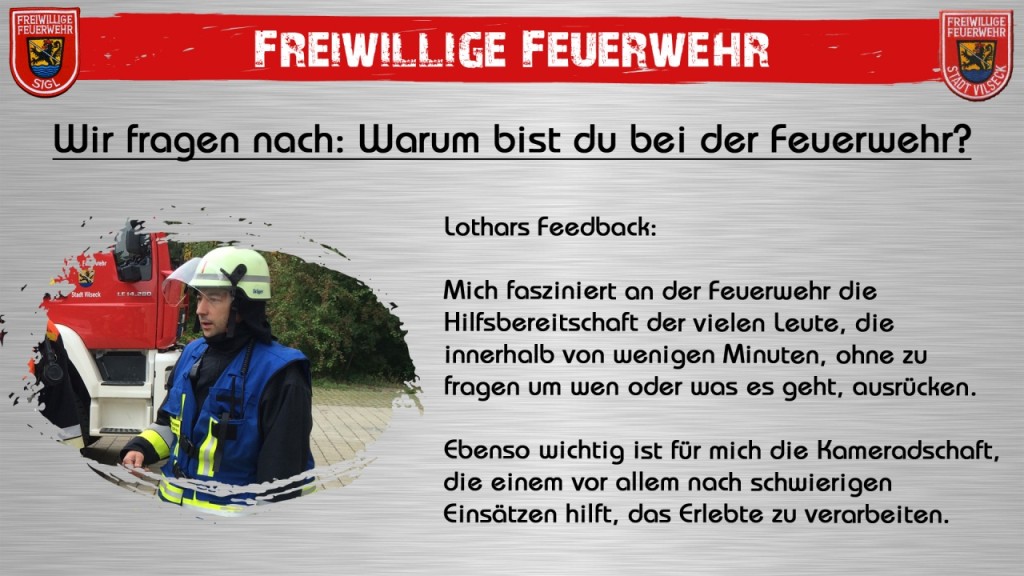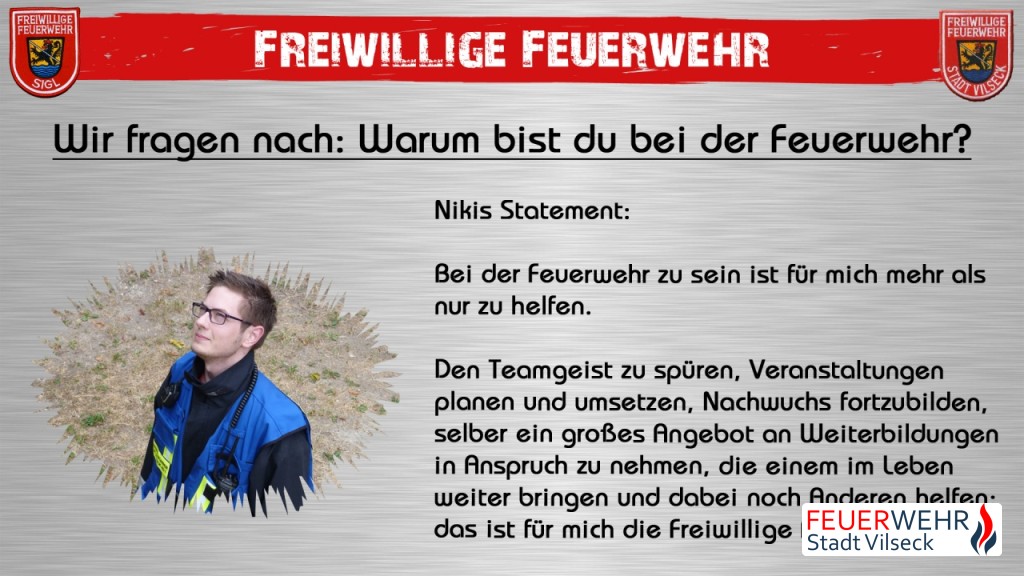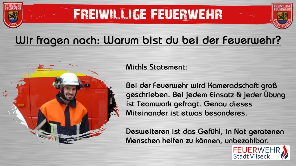 Wir haben 12 Feuerwehrfrauen- und Männer beider Feuerwehren gefragt, was ihre Motivation ist, sich ehrenamtlich bei der Freiwilligen Feuerwehr zu engagieren. Alles 12 Statements können auf unserer fb- Seite angesehen werden.
