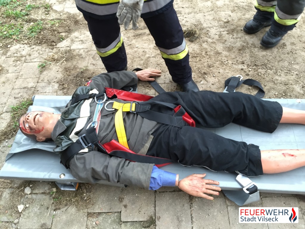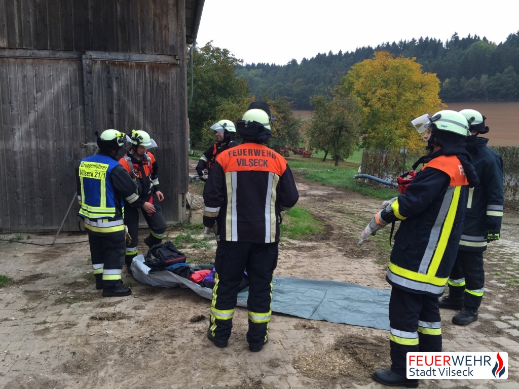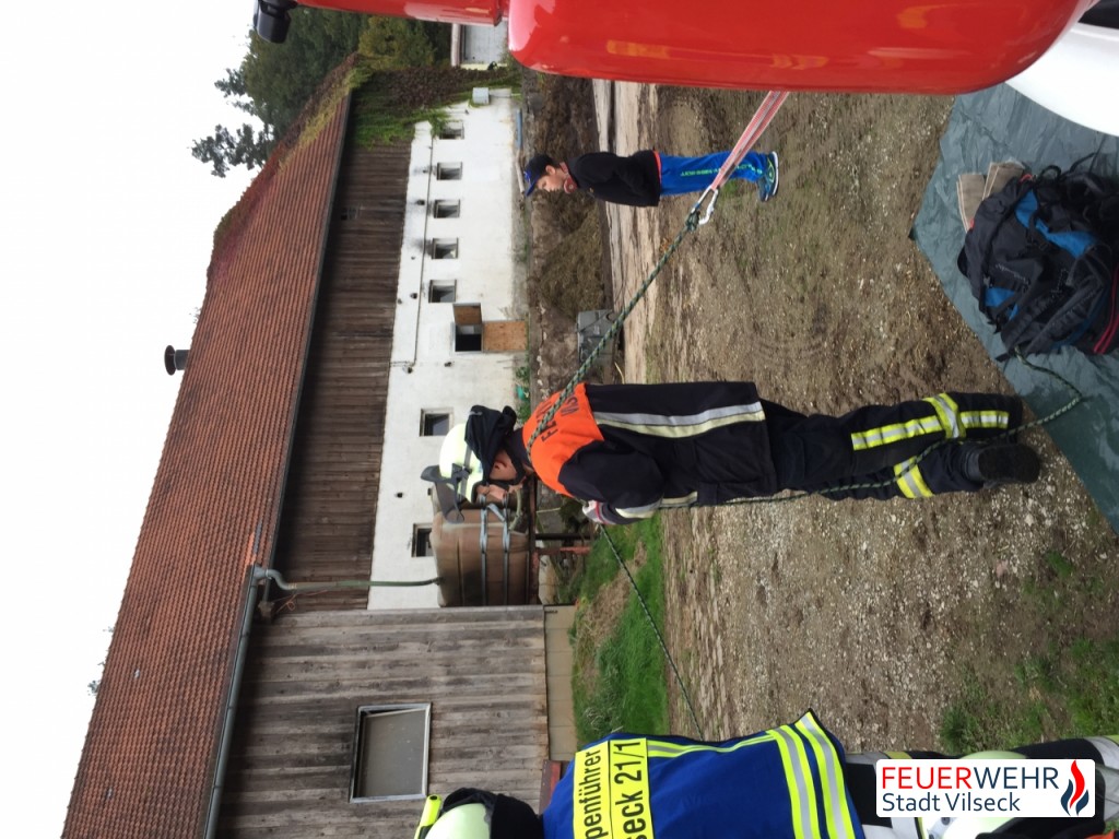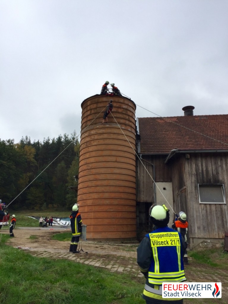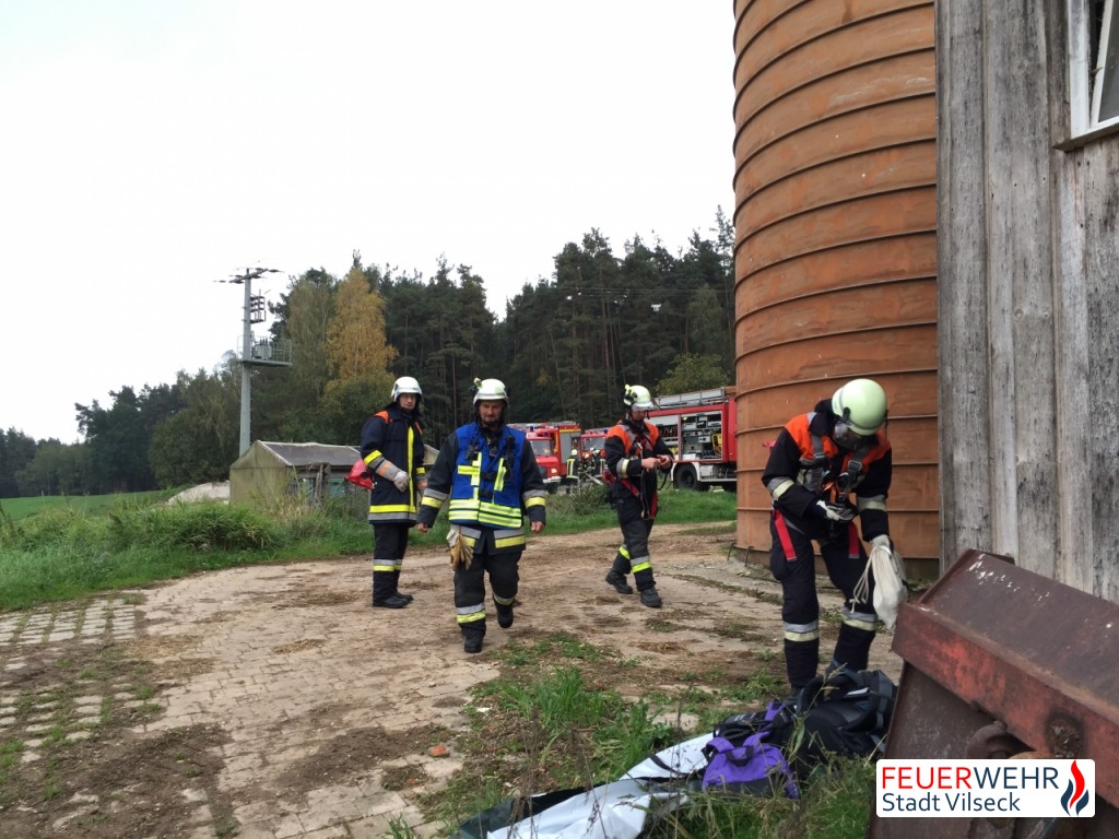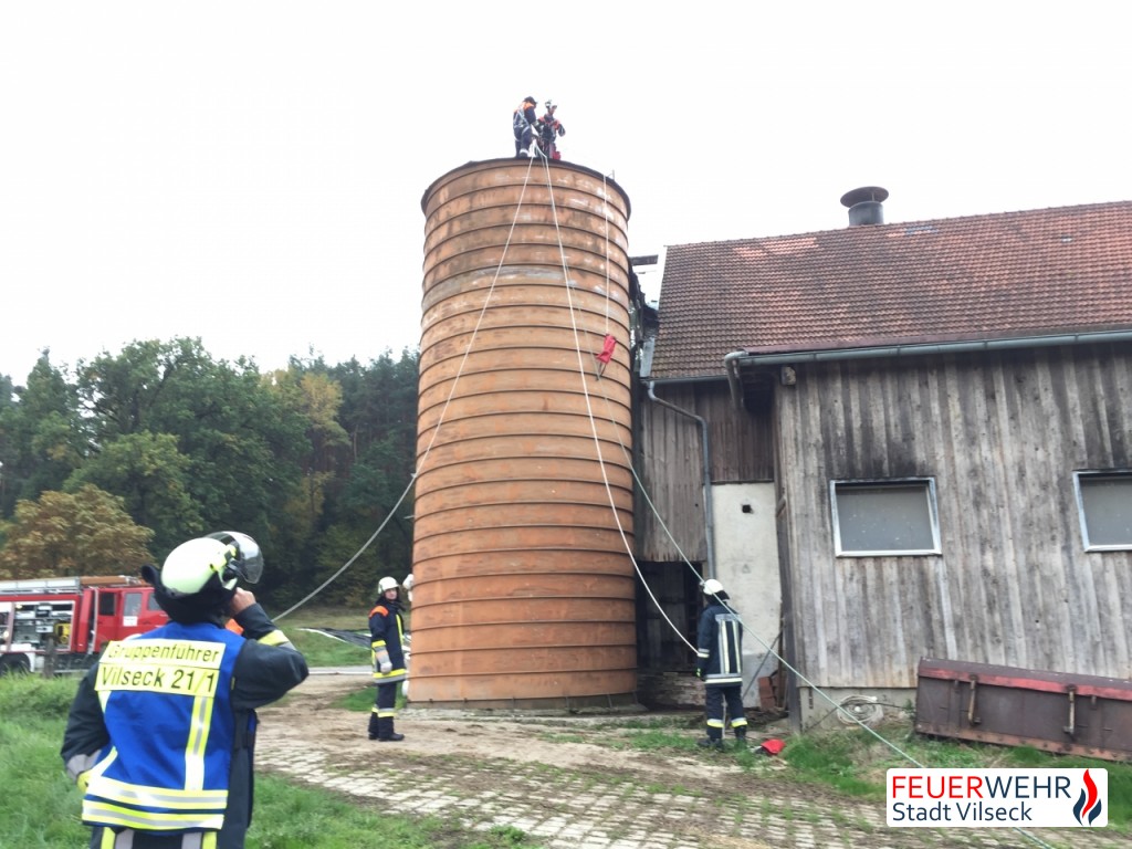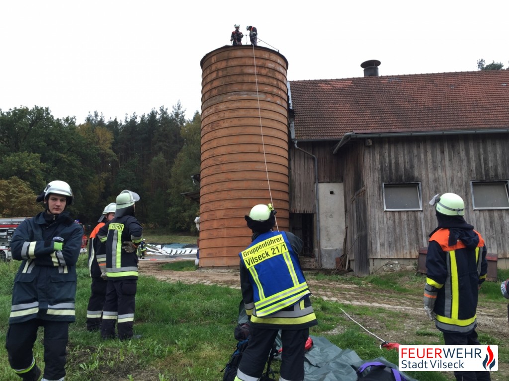 Parallel wurde durch die Kräfte des Tank-Lösch-Fahrzeugs (TLF) die Rettung der erkrankten Person auf dem Silo vorbereitet. Durch die weitgefächerten Ausbildungsmöglichkeiten bei der Feuerwehr Vilseck konnten zwei Helfer, die aktiv in der Absturzsicherungsgruppe sind, auf das Silo aufsteigen, die Person versorgen und anschließend schonend ablassen und somit retten.