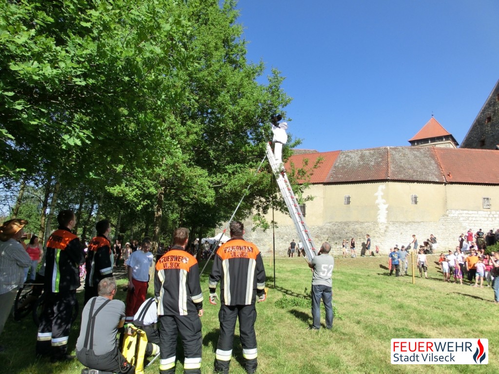 Für das Ritterlager in der Burg Dagestein, welches am Wochenende des 27. und 28. Mai stattfand, teilten sich 19 Feuerwehrkräfte in vier Schichten den 19h- Dienst. Neben der allgemeinen Absicherung der Veranstaltung wurde hier der Einzug der Ritter, eine große Feuershow, sowie auch der große Festumzug abgesichert. Als während einer Reitvorführung plötzlich ein Bienenschwarm anflog und sich in einem Baum eingenistet hatte, wurde das diensthabende Personal umgehend von besorgten Besuchern informiert. Zusammen mit einem „Ritter“, im wahren Leben Imker, wurde der Ast abgeschnitten und die Bienen in eine sichere Umgebung umgesiedelt. Die anwesenden Showgäste applaudierten der Feuerwehr für die ungewollte Showeinlage.