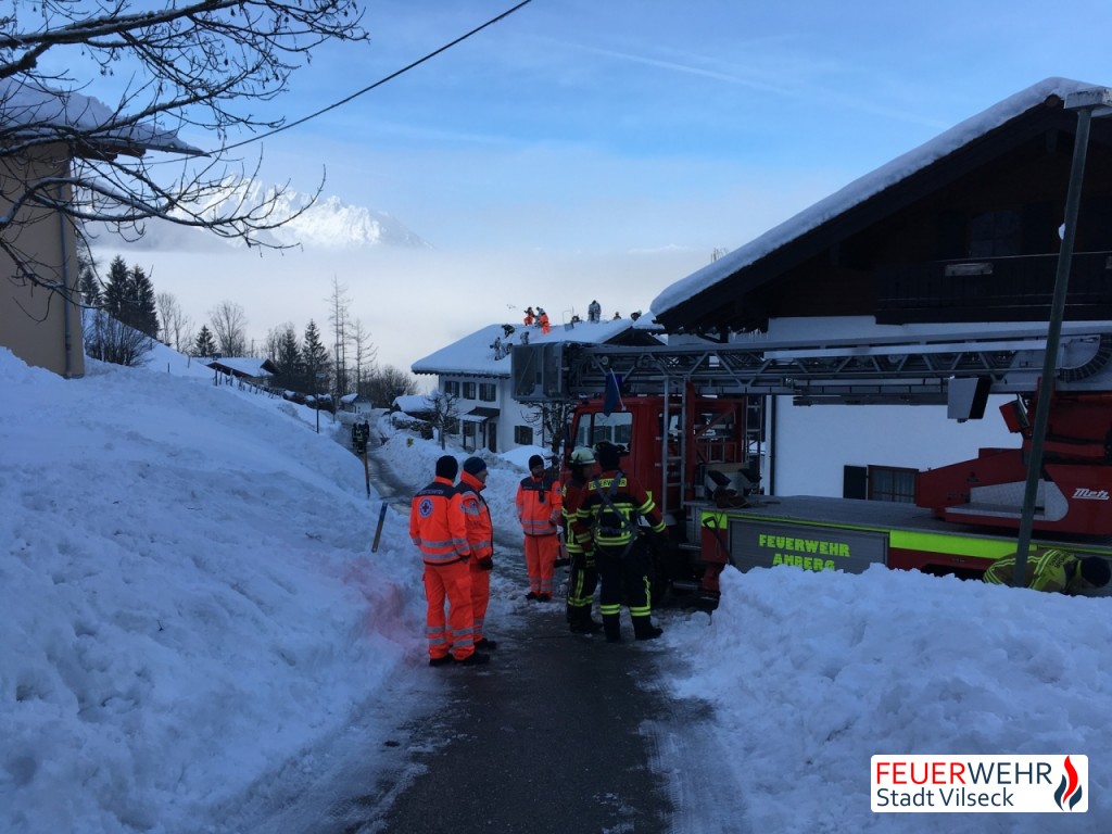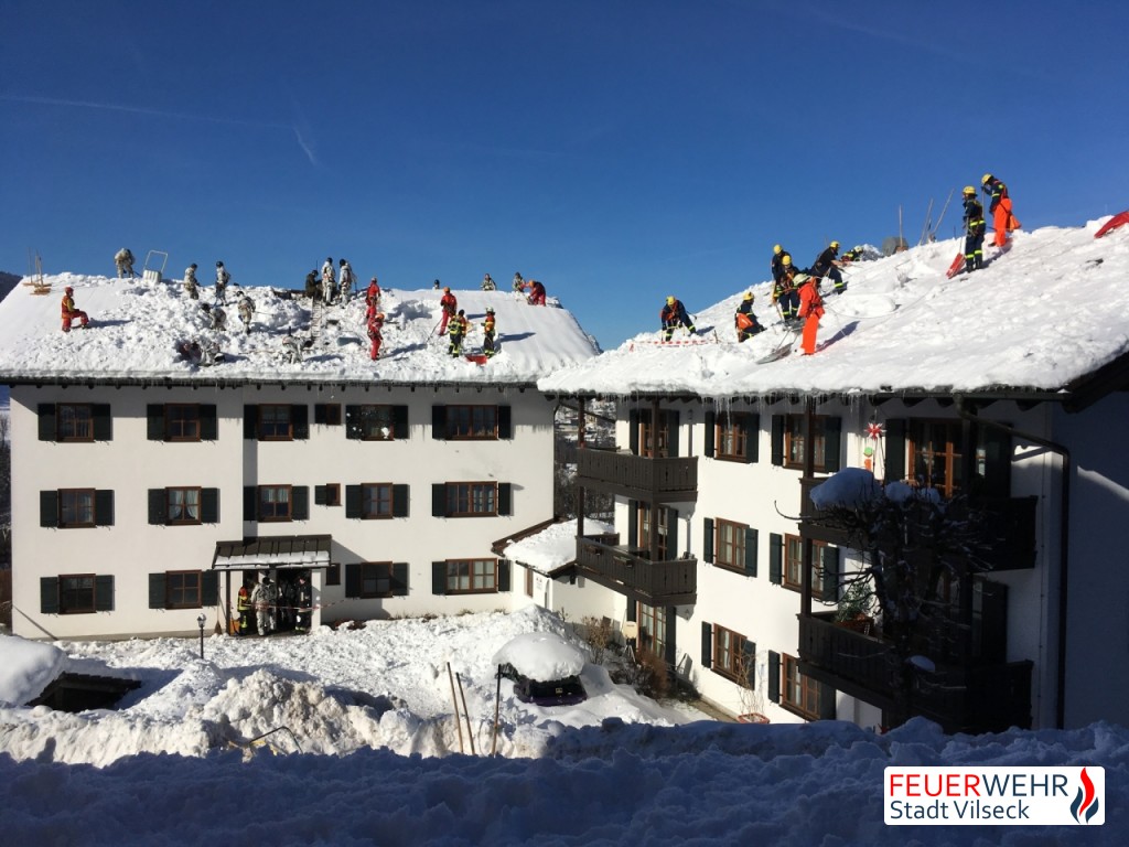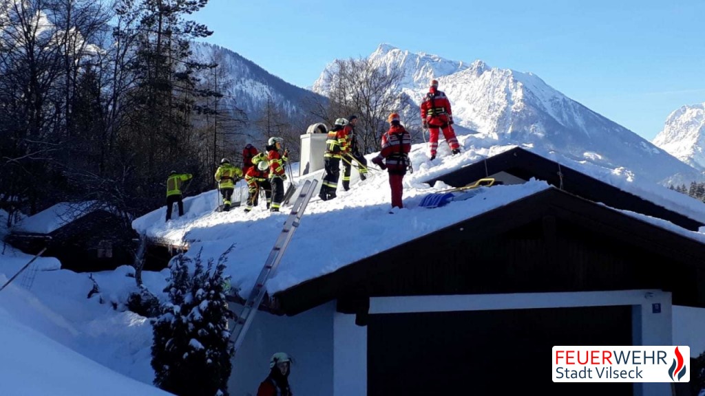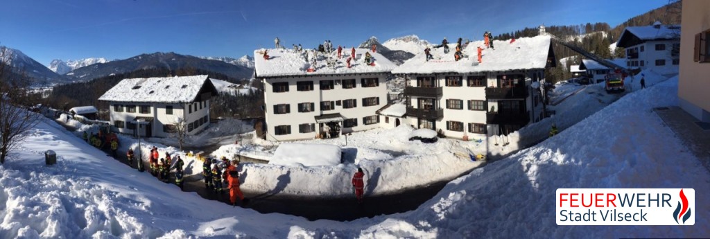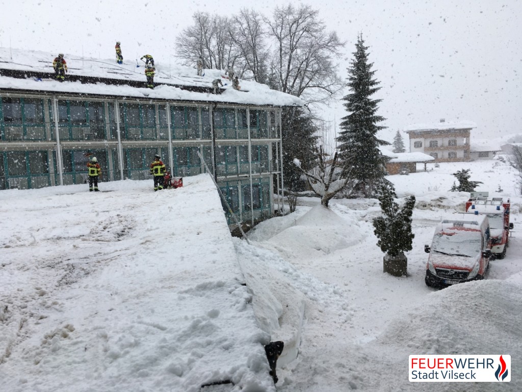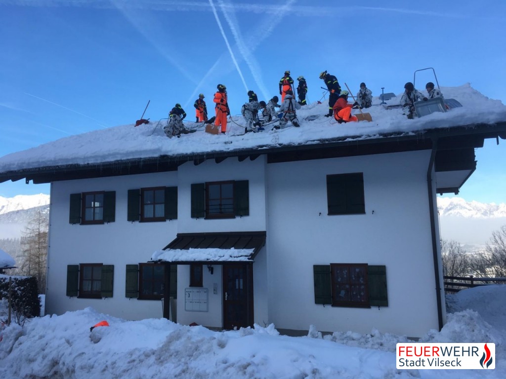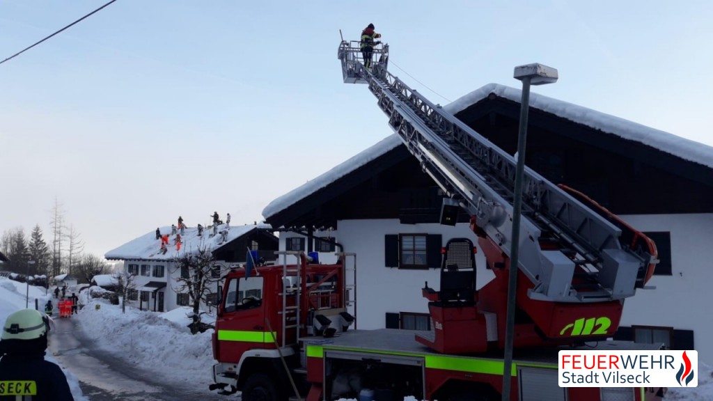 Wie bereits berichtet standen am ersten und zweiten Einsatztag die Schneearbeiten an einer Klinik auf dem Programm. Nachdem die Einsatzkräfte die Einsatzstelle schließlich gegen Dienstagmittag an den Besitzer übergeben konnten, rückten sie als Voraustrupp zum nächsten Einsatzgebiet vor. Unter Zuhilfenahme einer Drehleiter konnten hier an den weiteren 1,5 Tagen in Summe 7 Häuserkomplexe von den Schneemassen befreit und vor weiterem Schaden bewahrt werden.