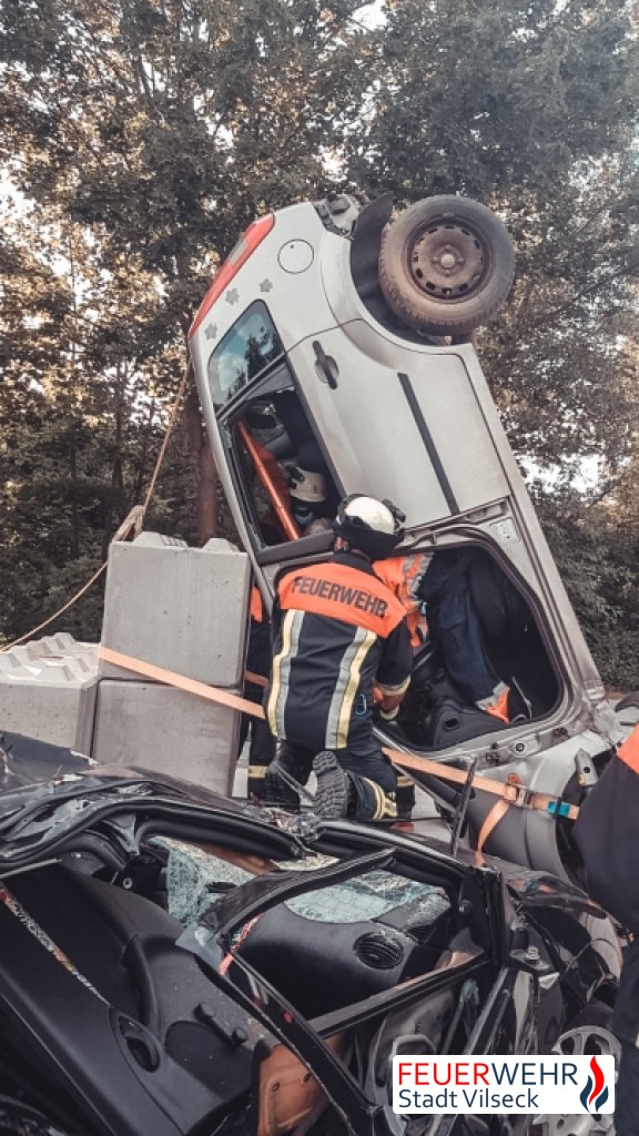 Um das senkrecht stehende Fahrzeug zu stabilisieren, wurde das Paratech- Rettungssystem, sowie Spanngurte genutzt und in alle Richtungen abgesichert. Um den eingeschlossenen Fahrer beurteilen zu können, sowie eine „Sicht von innen“ an den Einheitsführer abzugeben, wurde ein „Innerer Retter“ in das Fahrzeuginnere geschickt, welcher den Patienten mit medizinischen Basismaßnahmen versorgte und den Kräften außerhalb des PKWs eine Information über den Patientenzustand geben kann.