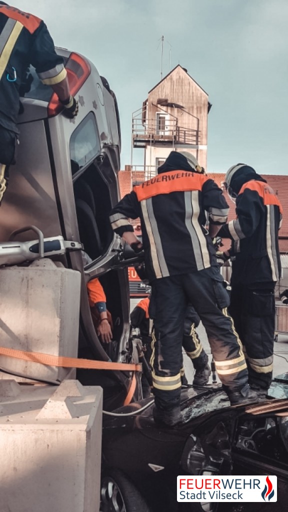 Abschließend konnten an den beiden „Unfallfahrzeugen“ verschiedene Techniken mit den hydraulischen Rettungsgeräten, Glasschneidern etc. unter Anleitung geübt werden.