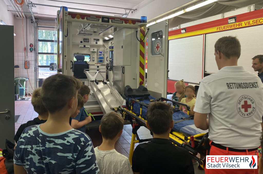 Schließlich kehrte auch noch der im Gerätehaus stationierten Rettungswagen (RTW) von einem Einsatz zurück, was zu strahlenden Augen bei den Kindern führte. Notfallsanitäter Tom präsentierte prompt auch dieses Fahrzeug und stand Rede und Antwort. Alle Fragen geklärt!