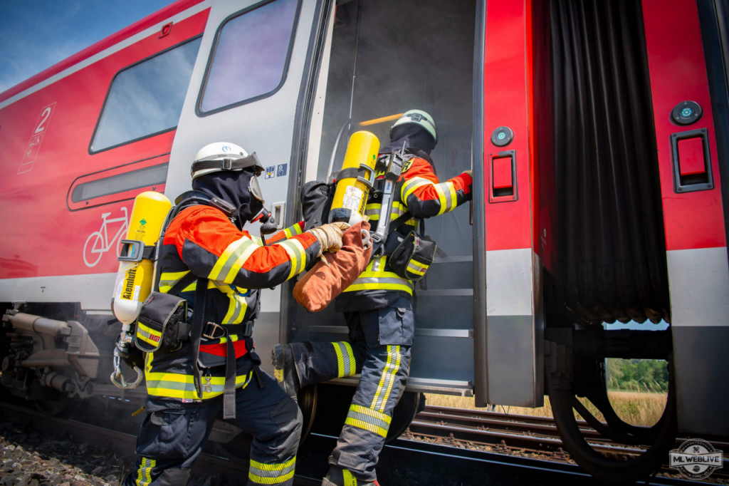 Gegen 13:30 Uhr folgte dann der „Alarm“ für die Einsatzübung: Auf freier Strecke der genannten Bahnstrecke kam ein Zug der Deutschen Bahn zum Stehen, durch den Zugführer wurde eine Rauchentwicklung im vollbesetzten Personenzug gemeldet.