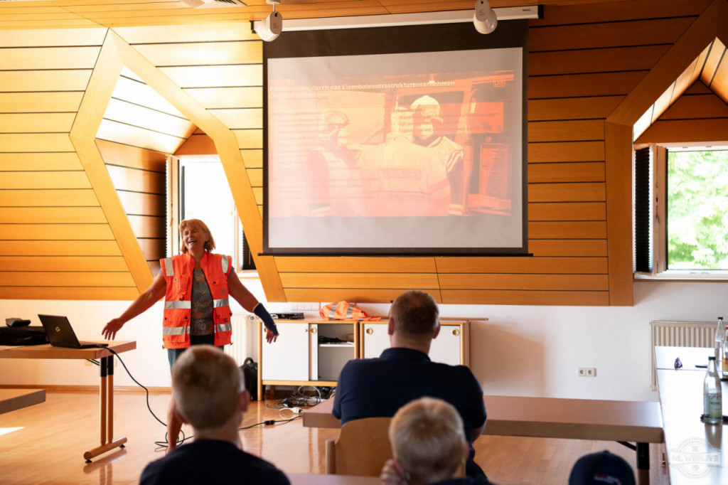 Im anschließenden Vortrag der DB Netz AG wurde den Zuhörern das Notfallmanagement der Deutschen Bahn nähergebracht und auf Nachfragen eingegangen. So konnten die beiden Notfallmanager einerseits ihren Aufgabenbereich im Einsatz erklären und andererseits nochmals die Wichtigkeit des „Sperrfaxes“ (Information über die angewiesene Gleissperrung) hervorheben. Gerade weil Einsätze im Gleisbereich oft einen tragischen Hintergrund haben, schätzen die Notfallmanager den kameradschaftlichen Umgang mit den Hilfsorganisationen sehr.