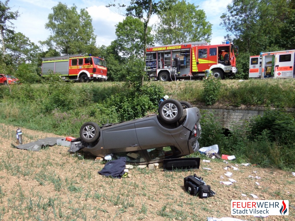 Da sich aus der Erstmeldung keine eingeklemmten Personen ergeben hatten, wurden die Feuerwehren Namsreuth und Königstein bereits einige Minuten zuvor durch die Integrierte Leitstelle (ILS) Amberg alarmiert. Unmittelbar nach dem Eintreffen des ersten Fahrzeugs der Feuerwehr Königstein musste die Lage und Einsatzstelle konkretisiert werden. Ein verunfallter PKW war von der Fahrbahn abgekommen, lag auf dem Dach, eine Person war in diesem eingeklemmt.
