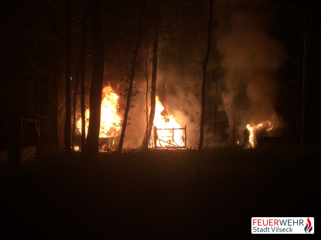 Schon auf der Anfahrt war ein heller Feuerschein aus dem betroffenen Waldstück sichtbar. Aus derzeit noch ungeklärter Ursache waren in dem Areal, auf dem jährlich die Sorghofer Waldweihnacht stattfindet, mehrere Verkaufsbuden und umliegender Wald in Brand geraten. Es brannte auf einer Fläche von ca. 100 m².