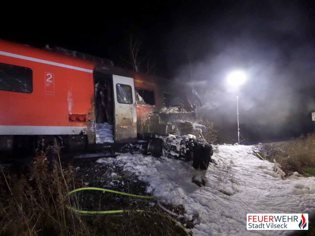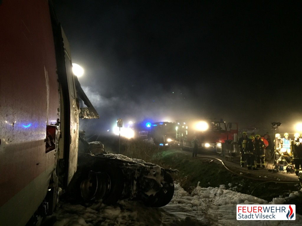 Noch während der Anfahrt der Kräfte der Feuerwehr Vilseck, welche mit HLF, TLF, GW- L und MTW anrückten, konnte durch den Kommandanten der Feuerwehr Freihung die Lage konkretisiert werden: das Zugfahrzeug des LKWs und die ersten 10m des Personenzuges standen im Vollbrand. Schon während der Anfahrt rüsteten sich die Atemschutzgeräteträger des Vilsecker HLF und TLF entsprechend aus, die Atemschutzgeräteträger der anderen Fahrzeuge wurden an der Einsatzstelle an der Atemschutzsammelstelle positioniert, um schnell ausreichend Atemschutzgeräteträger an der Einsatzstelle parat zu haben.
