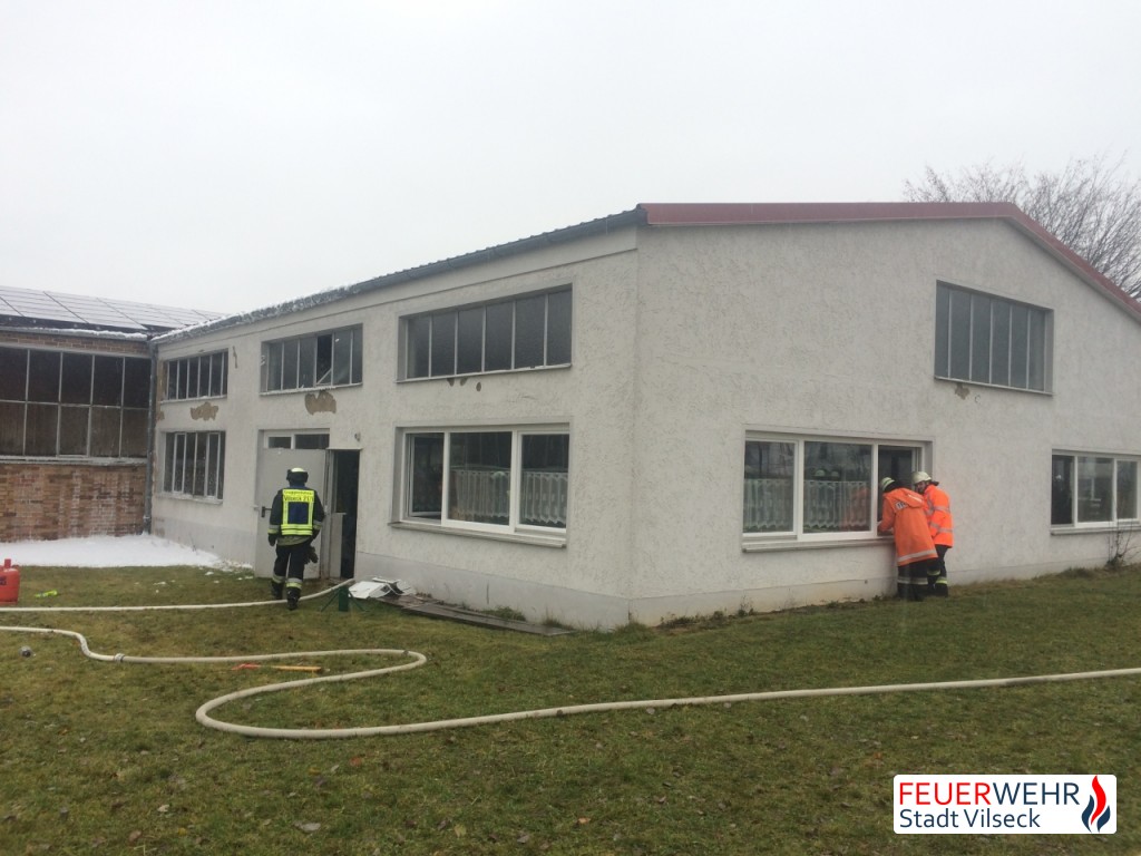 Zusammen mit den Einsatzkräften der Feuerwehren Schlicht, Gressenwöhr, Sorghof, Freihung und Hirschau wurde die Feuerwehr Vilseck am Montag, den 30.11.15 gegen 11.45 Uhr zu einem Werkstattbrand im Vilsecker Bauhof in der Rinostraße alarmiert.