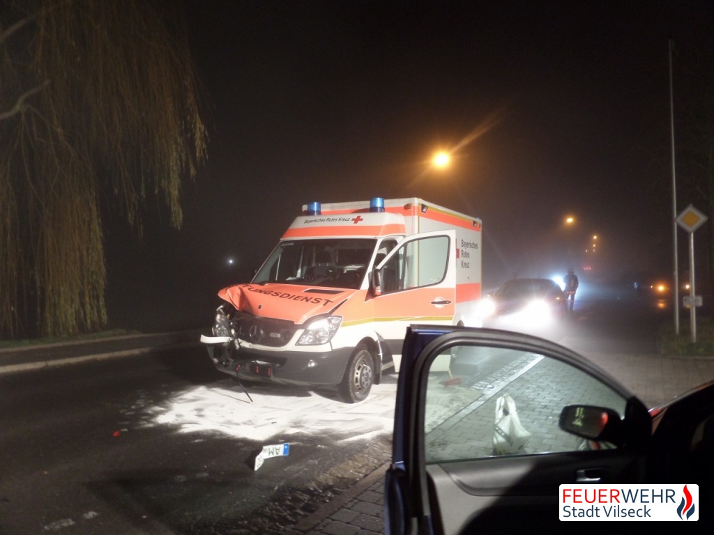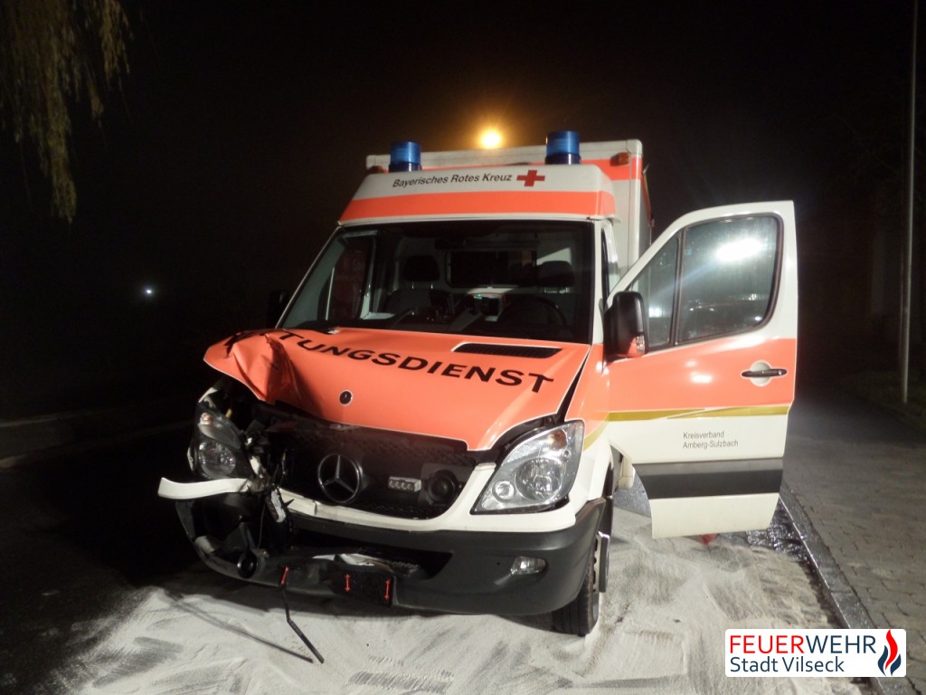 Ein Rettungswagen (RTW) des Bayerischen Roten Kreuzes kollidierte auf dem Weg zu einem Notfalleinsatz mit einem PKW und kam unmittelbar vor dem Gerätehaus der Feuerwehr Vilseck zum Stehen.