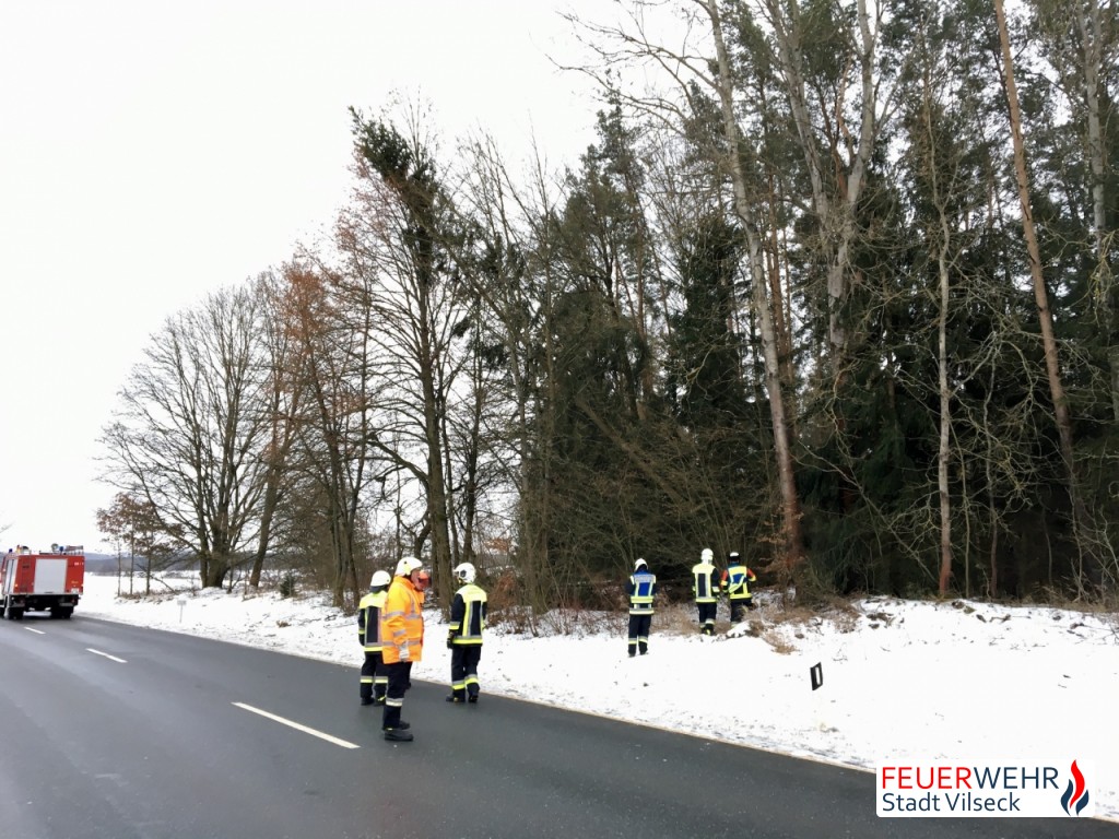 Um 7.21 Uhr wurde die Feuerwehr Vilseck zu einem gemeldeten Verkehrsunfall auf die St2166 Richtung Freihung alarmiert. Nachdem die Lenkerin des PKWs unverletzt war, konzentrierte sich die Aufgabe der Feuerwehr auf die Beseitigung eines massiven Baumes, welcher die komplette Fahrbahn blockierte.