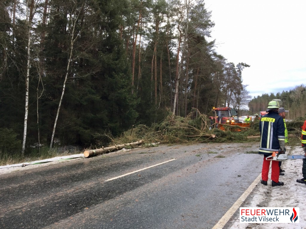Parallel hierzu wurde das Tanklöschfahrzeug zu einem umgestürzten Baum in die Dr. Reichenberger- Str. alarmiert. Hier entwurzelte „Egon“ einen massiven Baum, beschädigte ein parkendes Auto und blockierte Fuß- und Fahrweg. Mit Unterstützung eines Frontladers des Vilsecker Bauhofs wurde der Baum beseitigt und die Straße wieder befahrbar gemacht.