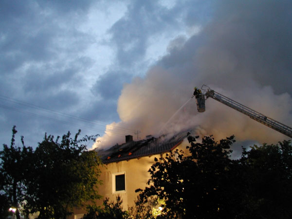 Da sich die Flammen jedoch bereits zu Beginn der ersten Löschmaßnahmen über die Holztreppe im gesamten Haus ausgebreitet hatten, musste ein Angriff über diesen Weg wieder angebrochen werden. Ein weiteres Vorgehen über die bereits stark abgebrannte Treppe war nicht mehr möglich. Auch mit einem zweiten Versuch über den Balkon im 1. Obergeschoss, war es nicht möglich einen Durchbrand ins Dachgeschoss zu verhindern. Begünstigt durch einen überwiegend aus Holz bestehenden Innenausbau konnte nicht verhindert werden, dass das Feuer schließlich auch den Dachstuhl erfasste und somit ein Innenangriff nicht mehr sicher durchgeführt werden konnte. Da zu diesem Zeitpunkt bereits von einem Totalschaden des Gebäudes ausgegangen werden musste, wurde der Innenangriff abgebrochen und versucht mit einer defensiven Taktik das Feuer von außen unter Kontrolle zu bringen.