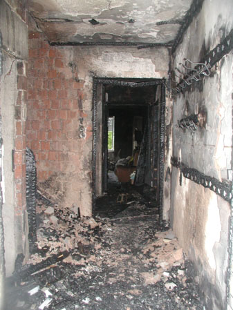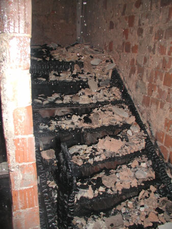 (links: Eingangsbereich im Erdgeschoss / rechts: abgebrannter Treppenraum zum