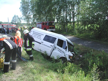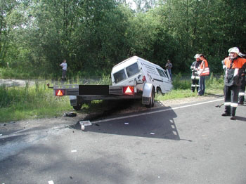 Nach dem Zusammenprall der beiden Fahrzeuge kam der Kastenwagen mit seinem Anhänger von der Straße ab und kam im Straßengraben zum Stehen. Da sich die Türen nicht mehr öffnen ließen, wurde der leichtverletzte Fahrer von der FFW Freihung mit hydraulischem Rettungsgerät befreit.