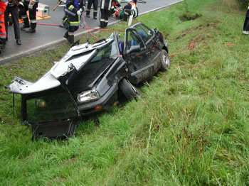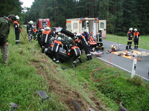 die Wehren Vilseck und Schlicht mit Hilfe von Rettungsscheren das Fahrzeugdach