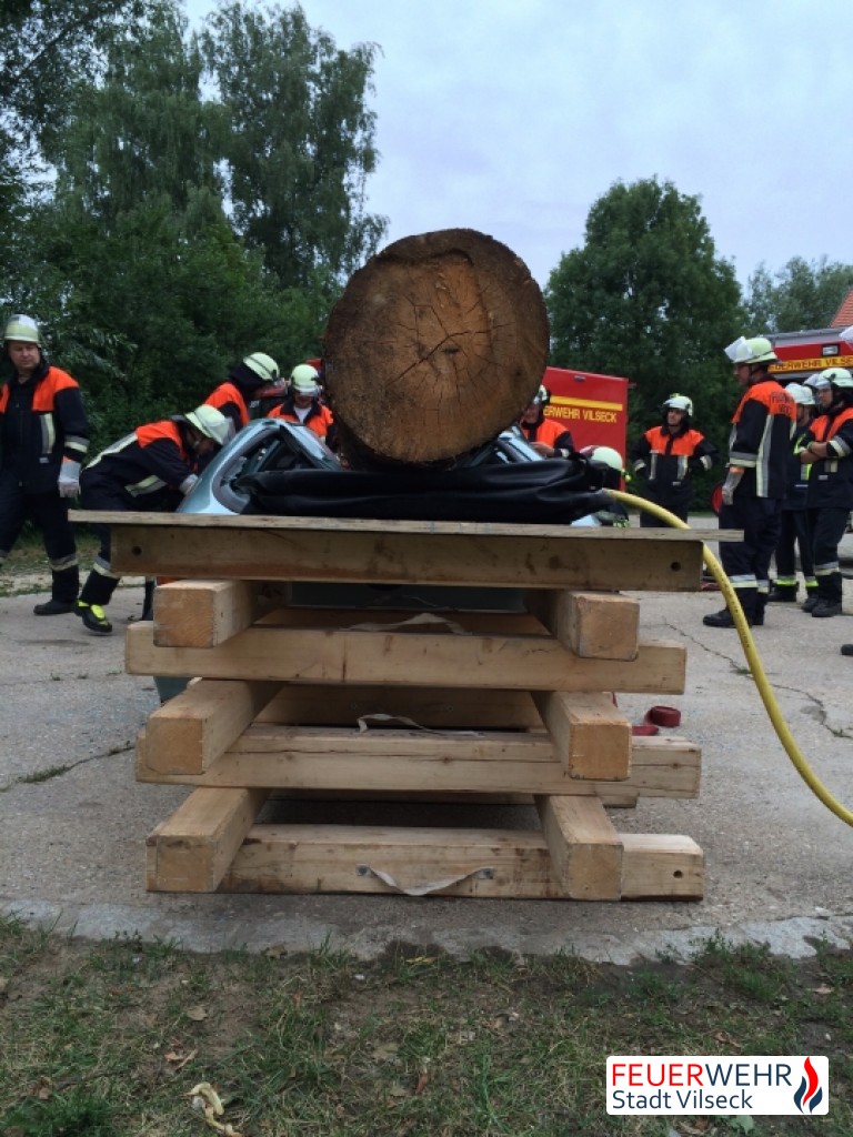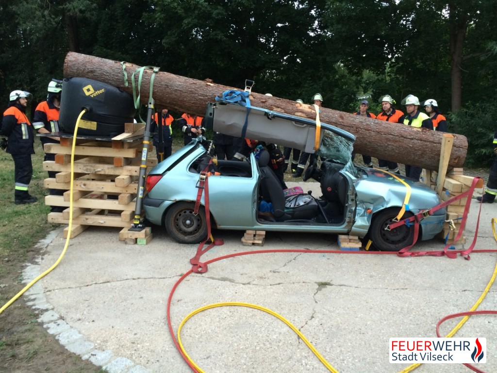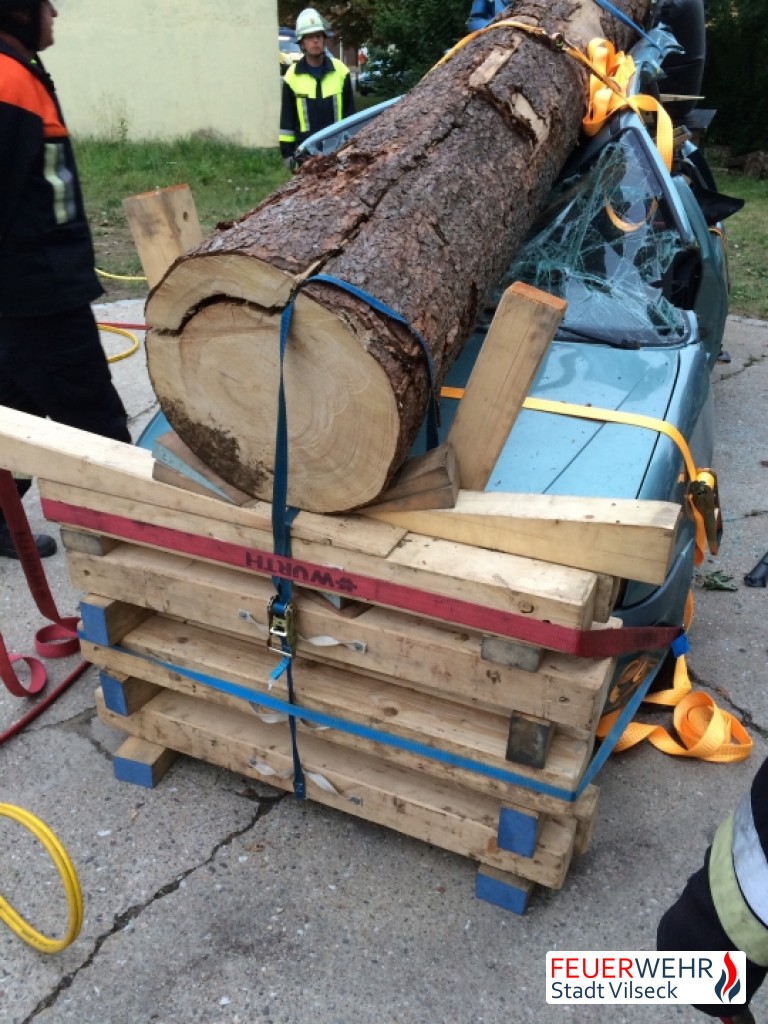 Ähnlich, wie auch bereits in der Übung zuvor, lag ein massiver Baumstamm auf einem PKW, in welchem sowohl Fahrer als auch Beifahrer in der Fahrgastzelle eingeklemmt waren. Jedoch bestand im Gegensatz zur vorangegangen Übung diesmal das Übungsziel, die Last größtmöglich anzuheben und die Personen anschließend zu retten.
