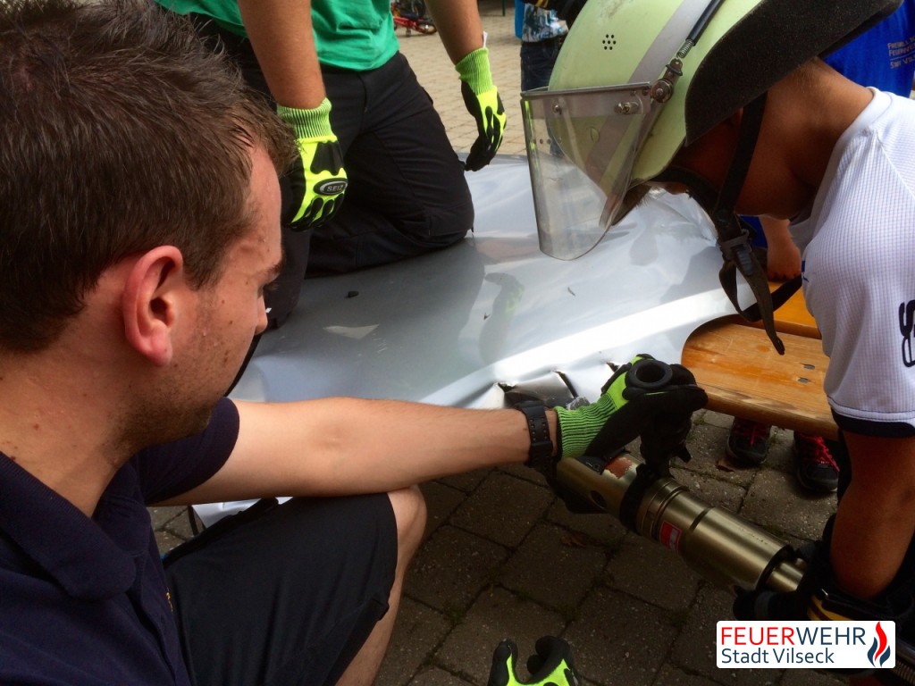 So konnten sie mit Rettungsschere und - Spreizer an einer Motorhaube schneiden und diese zusammendrücken, mit einem Feuerwehrschlauch auf ein Ziel löschen oder sogar damit kegeln.