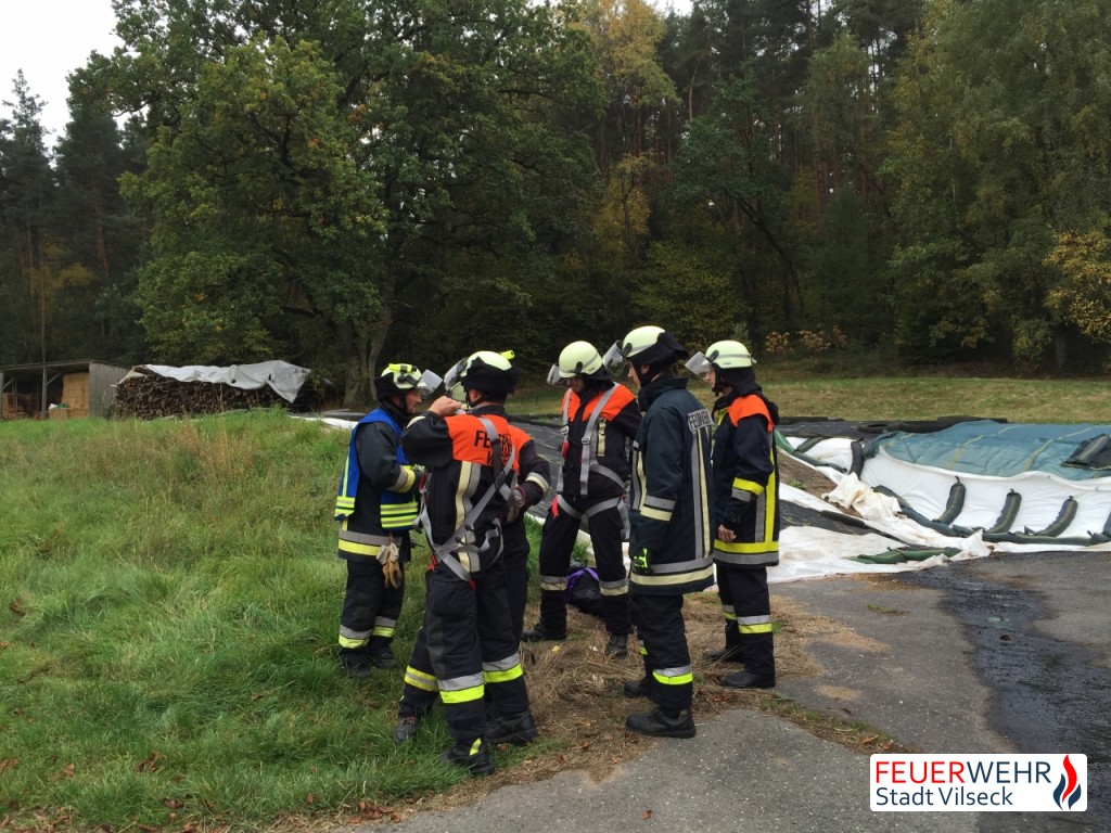 Weiterhin war auf einem Hochsilo eine Person verletzt und konnte sich selbst nicht mehr aus seiner misslichen Lage befreien, eine weitere Person war Richtung Wald geflüchtet.