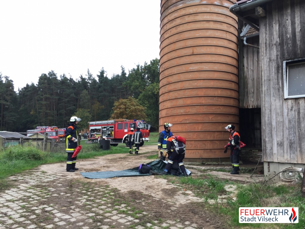 Parallel wurde durch die Kräfte des Tank-Lösch-Fahrzeugs (TLF) die Rettung der erkrankten Person auf dem Silo vorbereitet. Durch die weitgefächerten Ausbildungsmöglichkeiten bei der Feuerwehr Vilseck konnten zwei Helfer, die aktiv in der Absturzsicherungsgruppe sind, auf das Silo aufsteigen, die Person versorgen und anschließend schonend ablassen und somit retten.