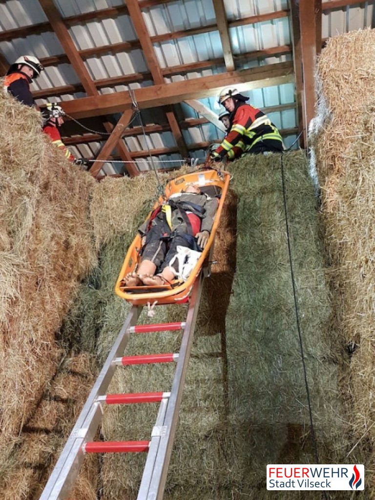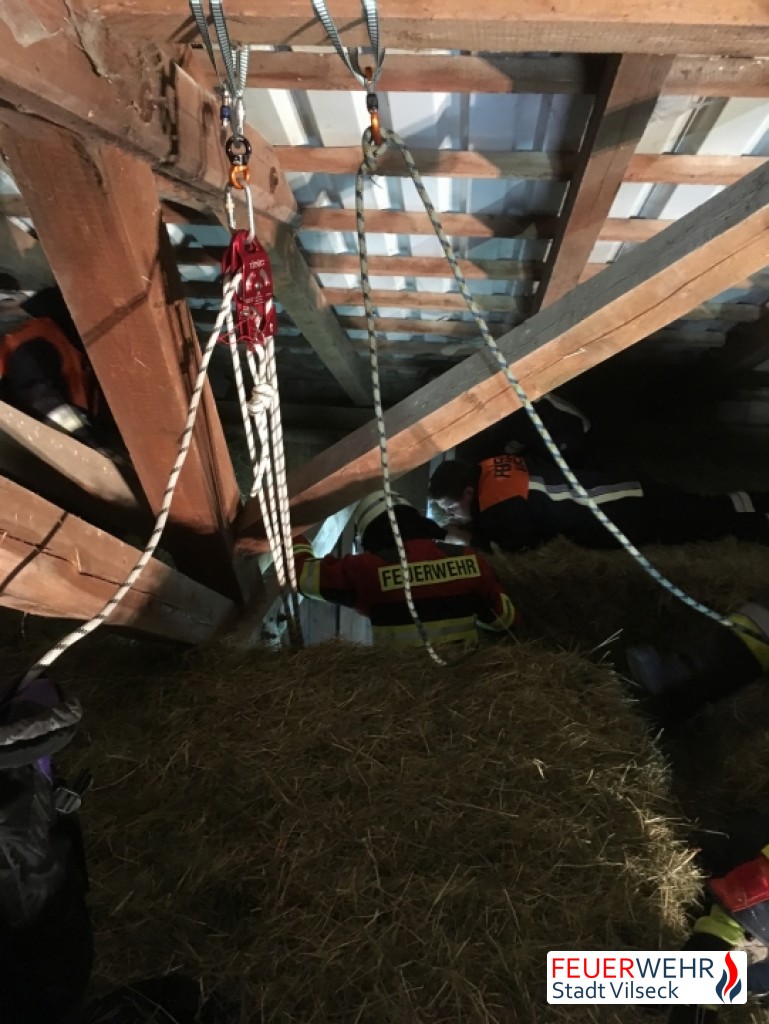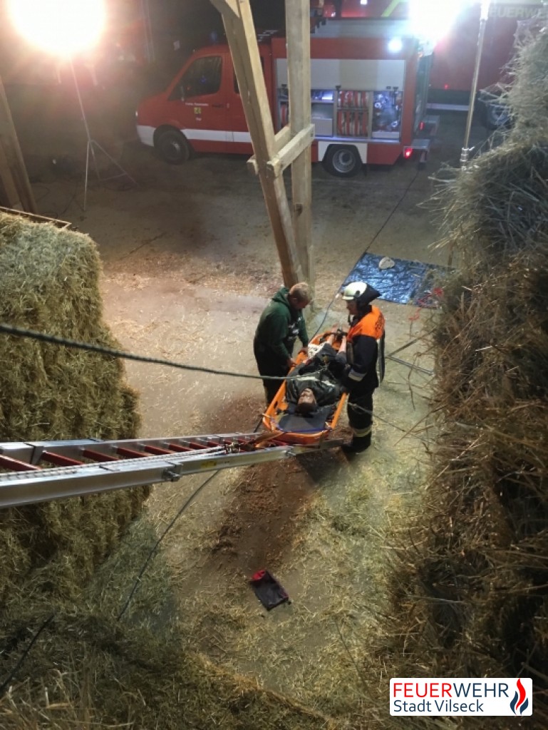 „Bei der abendlichen Tätigkeit im Lagerraum für Heu stürzte am Dienstag, den 20.09.2016 ein Landwirt in einen rund 7m tiefen Zwischenraum. Durch laute Hilferufe konnte der Verletzte auf sich aufmerksam machen, sodass durch die Ehefrau Feuerwehr und Rettungsdienst verständigt werden konnte.“
