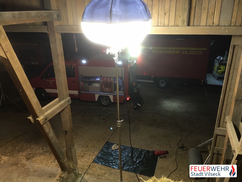 Auch die Ausleuchtung der Einsatzstelle sollte nicht einfach von Statten gehen: auf Grund des trockenen Heus konnte der herkömmliche Halogenstrahler nicht eingesetzt werden. Besonders nützlich erwies sich hierbei wieder einmal der PowerMoon, sowie der 12V- LED- Strahler aus dem TSF der Feuerwehr Sigl.