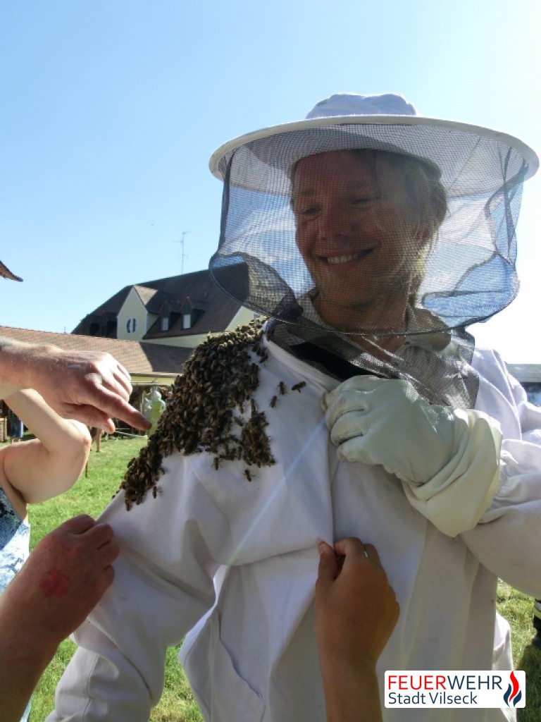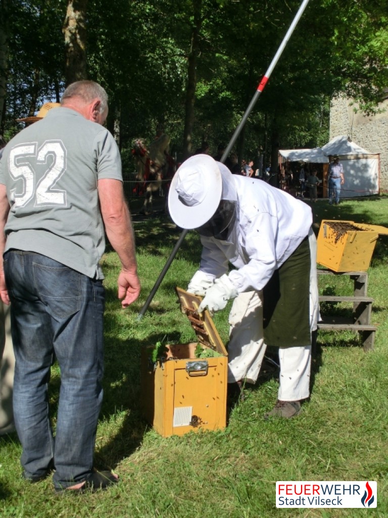 Für das Ritterlager in der Burg Dagestein, welches am Wochenende des 27. und 28. Mai stattfand, teilten sich 19 Feuerwehrkräfte in vier Schichten den 19h- Dienst. Neben der allgemeinen Absicherung der Veranstaltung wurde hier der Einzug der Ritter, eine große Feuershow, sowie auch der große Festumzug abgesichert. Als während einer Reitvorführung plötzlich ein Bienenschwarm anflog und sich in einem Baum eingenistet hatte, wurde das diensthabende Personal umgehend von besorgten Besuchern informiert. Zusammen mit einem „Ritter“, im wahren Leben Imker, wurde der Ast abgeschnitten und die Bienen in eine sichere Umgebung umgesiedelt. Die anwesenden Showgäste applaudierten der Feuerwehr für die ungewollte Showeinlage.