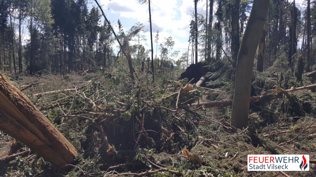 „In der Nacht von Mittwoch auf Donnerstag, genauer gesagt am Mittwoch zwischen 22:57 und 23:03 CEST produzierte eine Schwergewitterzelle einen F2 Macroburst. Die besagten Sturmschäden auf der St2166 lagen im "Left-Exit" des Macroburst. Es wurden vom Macroburst Verwirbelungen verursacht (lokal konvergentes Fallmuster, jedoch insgesamt divergent). Ein Tornado konnte schadensanalytisch nicht nachgewiesen werden.“