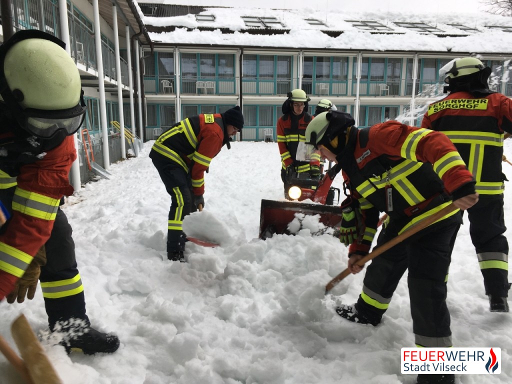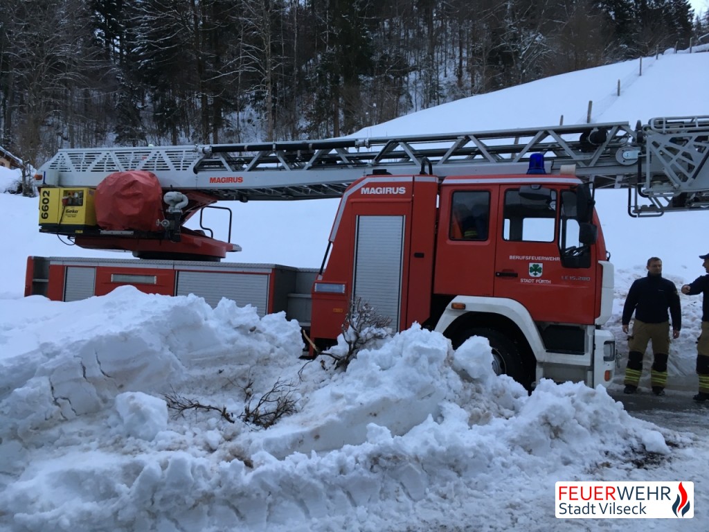 Wie bereits berichtet standen am ersten und zweiten Einsatztag die Schneearbeiten an einer Klinik auf dem Programm. Nachdem die Einsatzkräfte die Einsatzstelle schließlich gegen Dienstagmittag an den Besitzer übergeben konnten, rückten sie als Voraustrupp zum nächsten Einsatzgebiet vor. Unter Zuhilfenahme einer Drehleiter konnten hier an den weiteren 1,5 Tagen in Summe 7 Häuserkomplexe von den Schneemassen befreit und vor weiterem Schaden bewahrt werden.