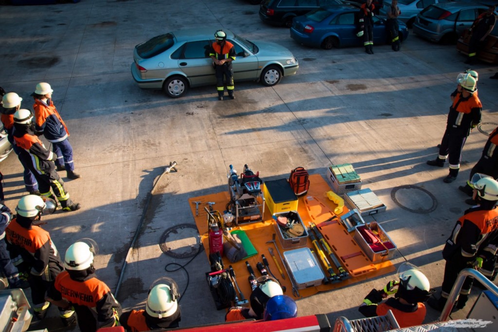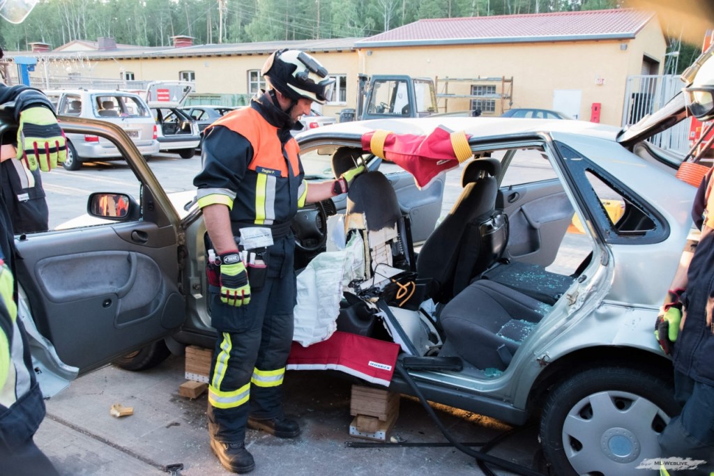 Während der Erkundung durch den Einheitsführer wurde durch die restlichen Kräfte die Geräteablage aufgebaut und durch die Ausbilder auf die einzelnen Bestandteile eingegangen. Nach dem Unterbau des Fahrzeugs und der Sicherung gegen ein ungewolltes Wegrollen konnte ein innerer Retter in das Auto vordringen und mit einer Patientenbetreuung beginnen. Währenddessen konnte mit Hilfe eines speziellen Werkzeugs nach Airbags gesucht und die Scheiben entfernt werden. In einer kurzen Absprache wurde entschieden, die Person mittels einer „großen Seitenöffnung“ zu retten, wozu die Türe hinter dem Fahrer geöffnet und an der B- Säule geschnitten und mit einem Rettungszylinder aufgedrückt wurde.