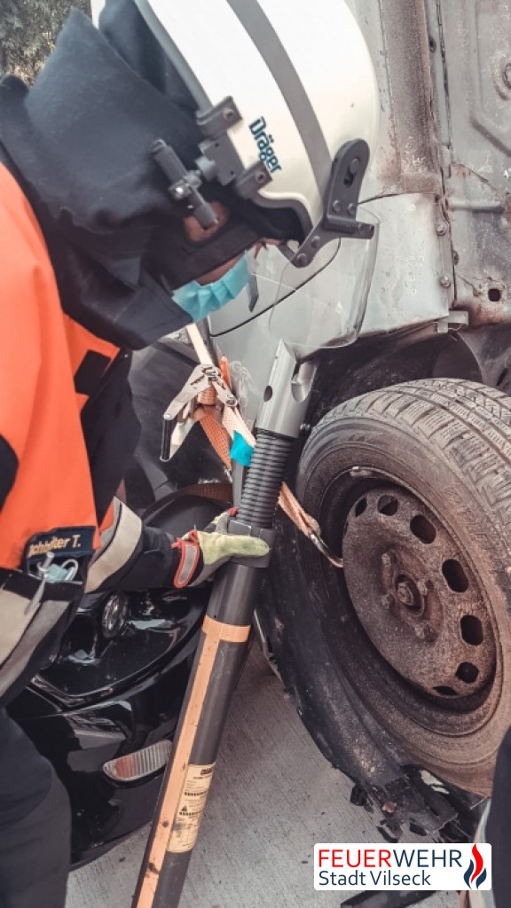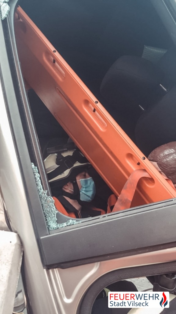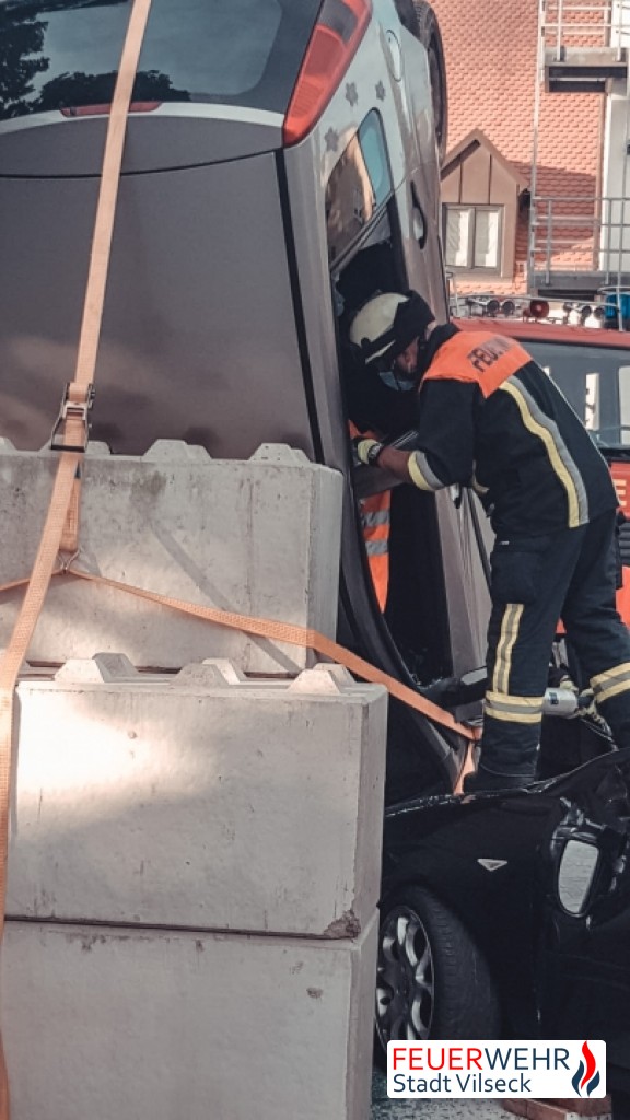 zwei PKWs waren frontal ineinander gefahren, wobei ein PKW auf der Front senkrecht zum Stehen gekommen war. Der Fahrer dieses Wagens war im Fahrzeug eingeschlossen und bei der ersten Erkundung nicht ansprechbar.