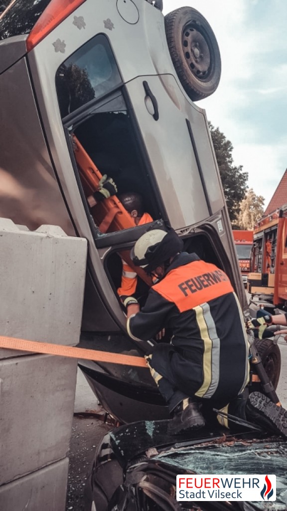 Um das senkrecht stehende Fahrzeug zu stabilisieren, wurde das Paratech- Rettungssystem, sowie Spanngurte genutzt und in alle Richtungen abgesichert. Um den eingeschlossenen Fahrer beurteilen zu können, sowie eine „Sicht von innen“ an den Einheitsführer abzugeben, wurde ein „Innerer Retter“ in das Fahrzeuginnere geschickt, welcher den Patienten mit medizinischen Basismaßnahmen versorgte und den Kräften außerhalb des PKWs eine Information über den Patientenzustand geben kann.