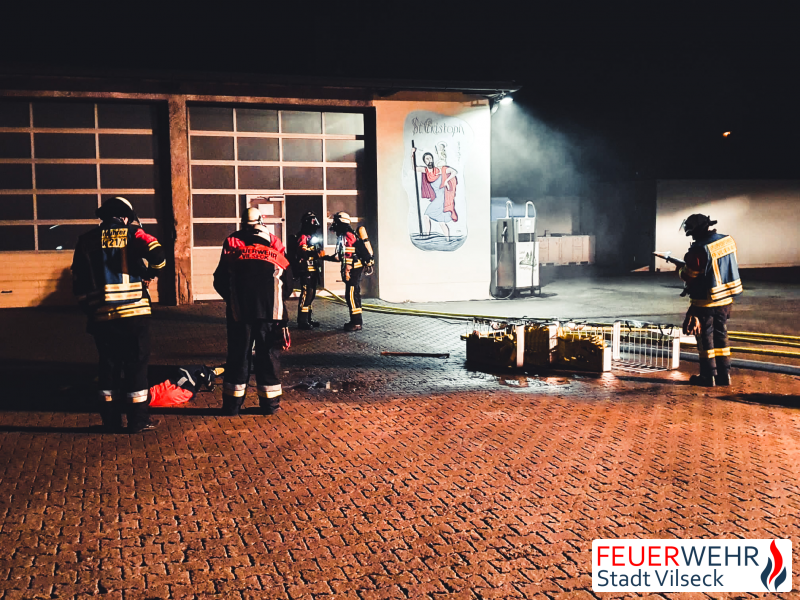 Um einen raschen Sucherfolg erzielen zu können, wurde parallel mit zwei Trupps unter schwerem Atemschutz vorgegangen, während der Sicherungstrupp am Verteiler vor dem Gebäude Stellung bezogen hatte. Der erste Teil der Halle, welcher durch eine Stahltüre von der Werkstatt getrennt war, konnte auf Grund geringer Rauchdichte schnell durchsucht und keine Person gefunden werden. Die Verrauchung in der Werkstatt selbst war jedoch nur noch ein Vorgehen unter „Nullsicht“ möglich. Mit Hilfe der Wärmebildkamera (WBK) konnten zwei Personen gefunden und ins Freie gebracht werden. Bei der weiteren Suche nach dem Brandherd konnte festgestellt werden, dass die massive Rauchentwicklung nicht durch ein offenes Feuer entstand, sondern durch eine vermutlich defekte Ölheizung ausging.