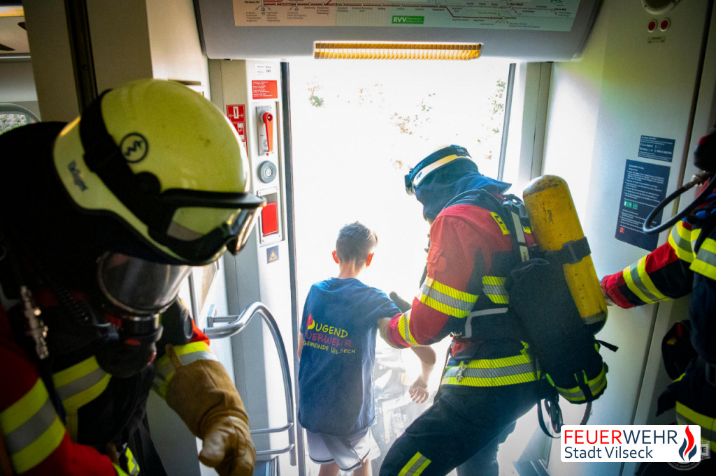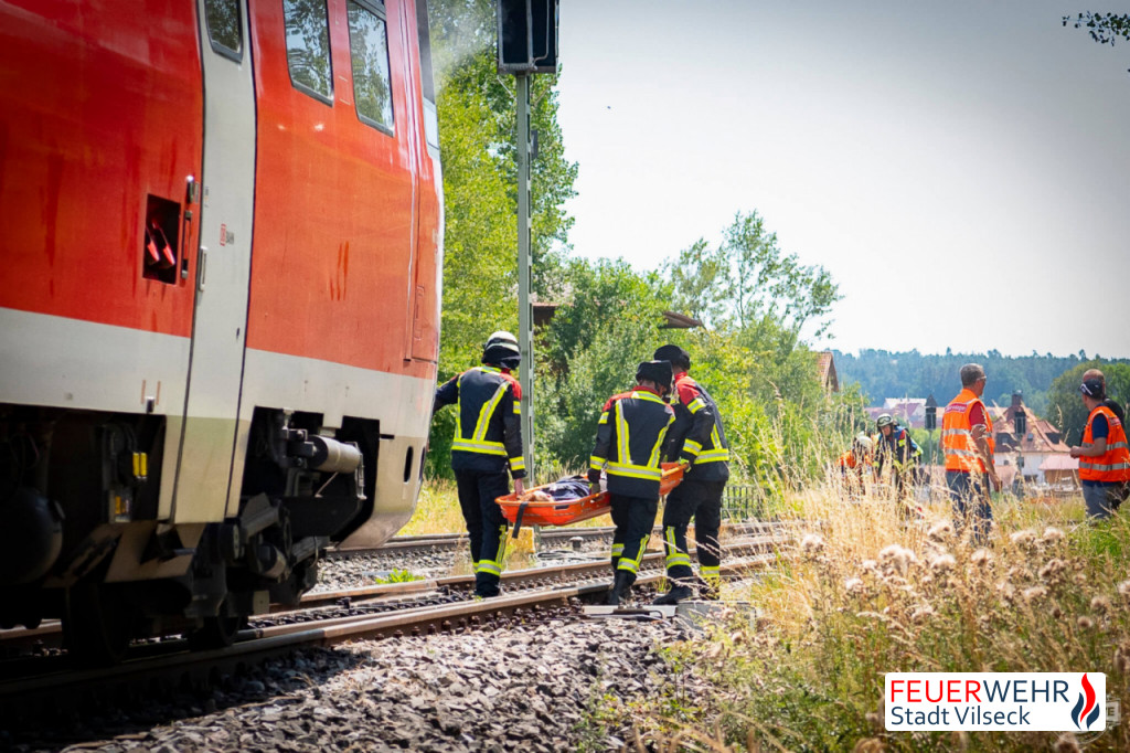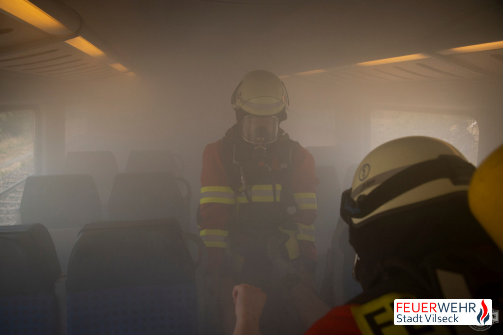 Beim Eintreffen der ersten Kräfte der Feuerwehr Stadt Vilseck musste zur Erkundung eine größere Fläche an Ackerland überquert werden, um zum Gleisbereich zu gelangen. Nachdem die Integrierten Leitstelle meldete, dass ein Sperrfax eingegangen war, konnte die Bahnanlage sicher betreten werden. Die Türen mussten manuell geöffnet werden.
