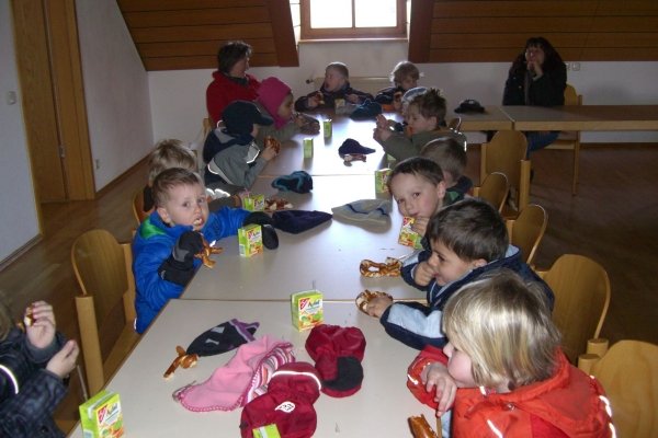 Im Unterrichtsraum angekommen, gab es eine kleine Stärkung in Form von Limonade und Brezen. Dazu wurde den Kindern noch einige Kurzvideos zum Thema Feuerwehr gezeigt, was bei den Kleinen großes Interesse hervorrief.