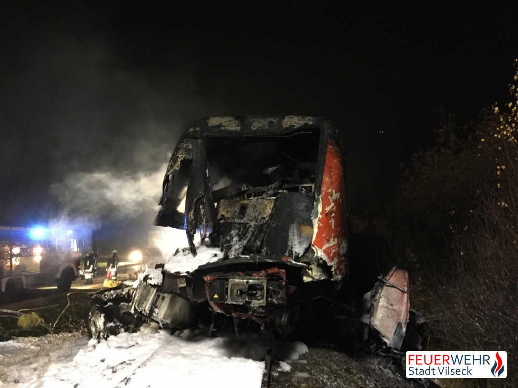 Noch während der Anfahrt der Kräfte der Feuerwehr Vilseck, welche mit HLF, TLF, GW- L und MTW anrückten, konnte durch den Kommandanten der Feuerwehr Freihung die Lage konkretisiert werden: das Zugfahrzeug des LKWs und die ersten 10m des Personenzuges standen im Vollbrand. Schon während der Anfahrt rüsteten sich die Atemschutzgeräteträger des Vilsecker HLF und TLF entsprechend aus, die Atemschutzgeräteträger der anderen Fahrzeuge wurden an der Einsatzstelle an der Atemschutzsammelstelle positioniert, um schnell ausreichend Atemschutzgeräteträger an der Einsatzstelle parat zu haben.