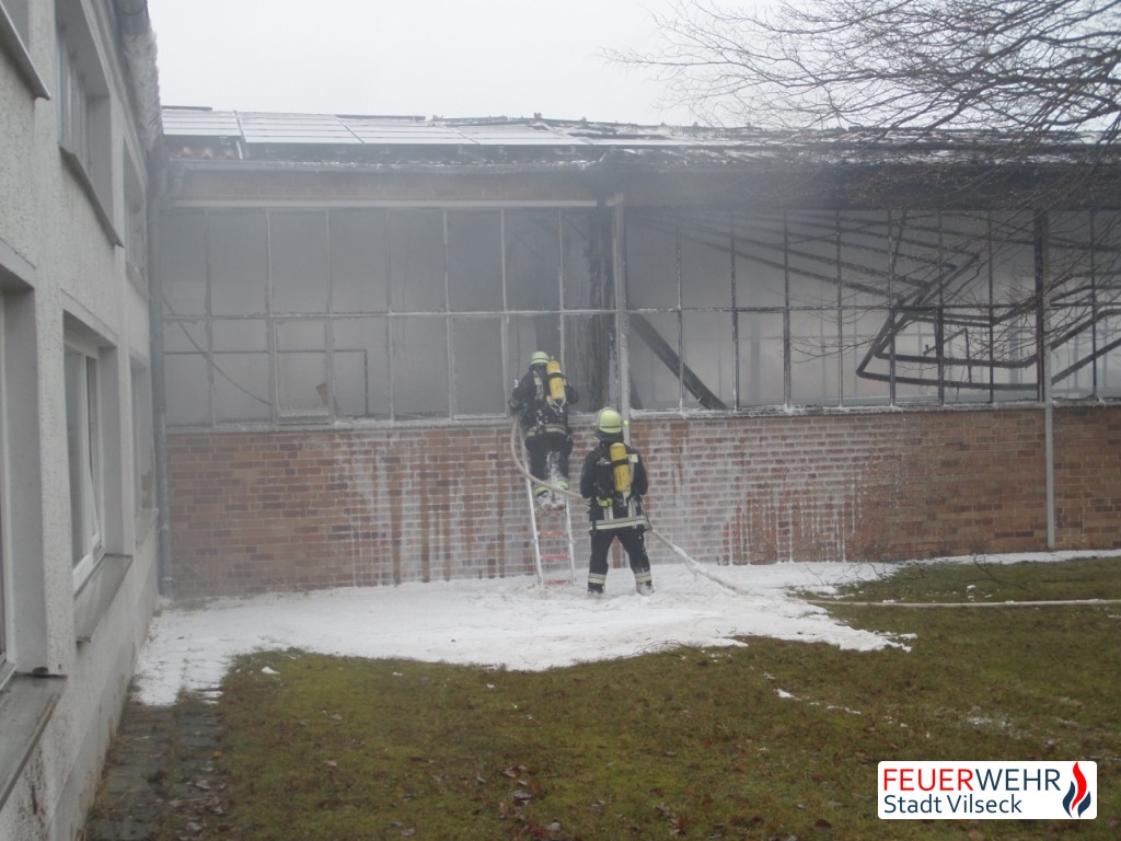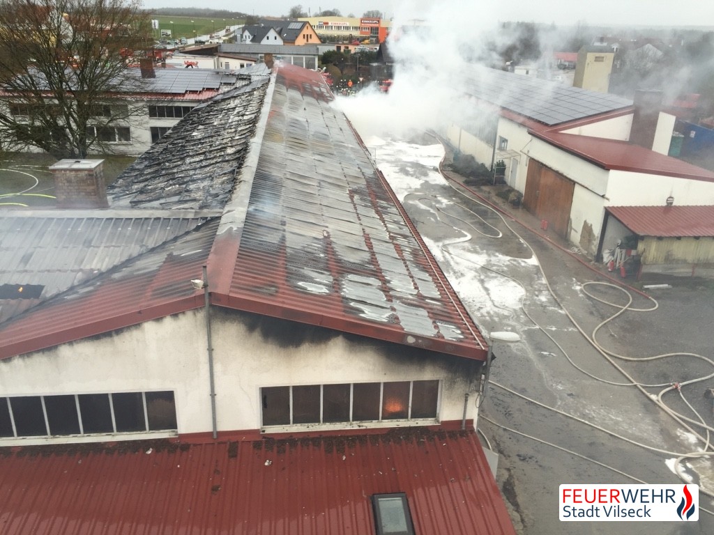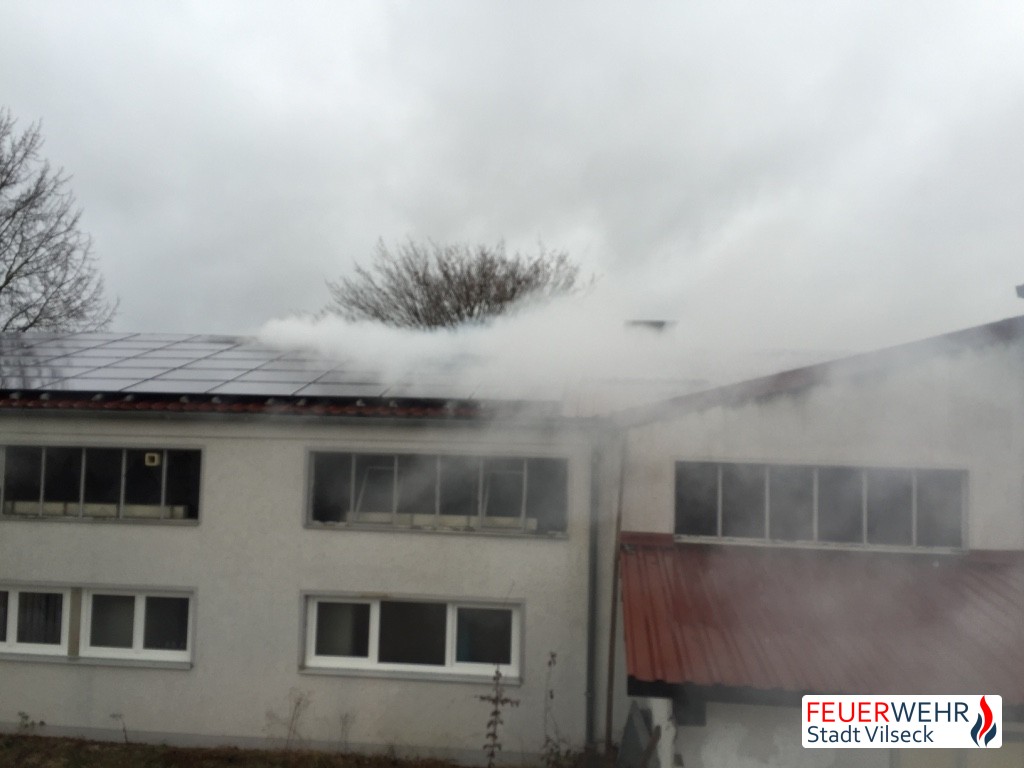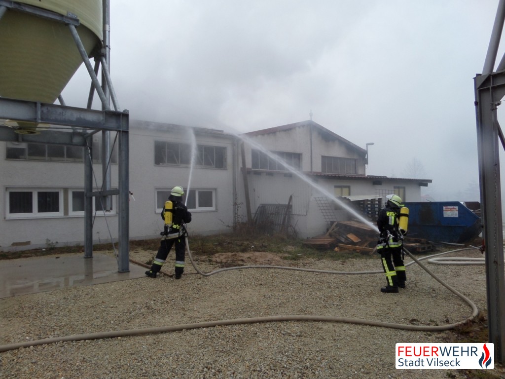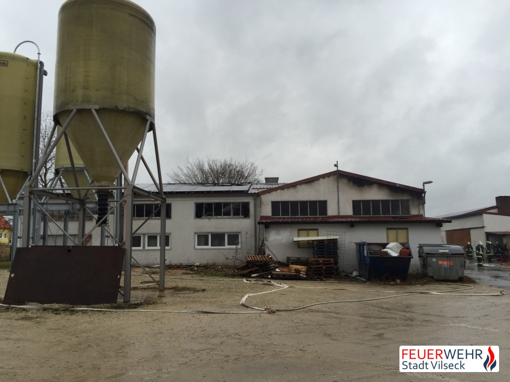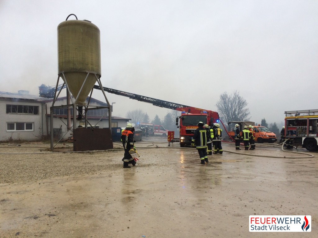 Zusammen mit den Einsatzkräften der Feuerwehren Schlicht, Gressenwöhr, Sorghof, Freihung und Hirschau wurde die Feuerwehr Vilseck am Montag, den 30.11.15 gegen 11.45 Uhr zu einem Werkstattbrand im Vilsecker Bauhof in der Rinostraße alarmiert.