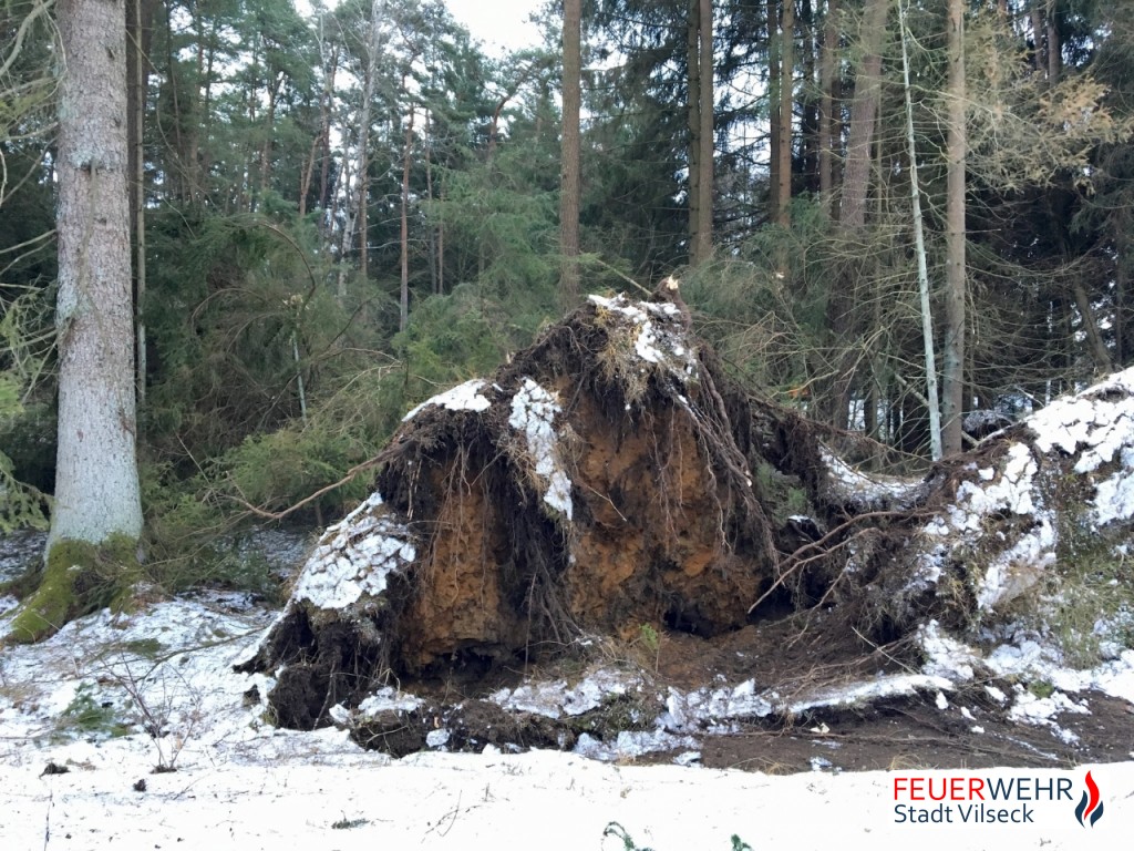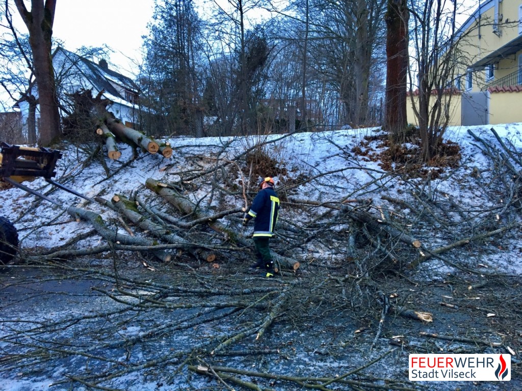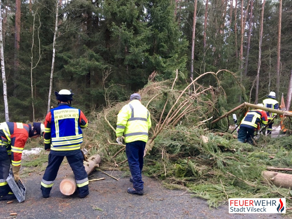 Parallel hierzu wurde das Tanklöschfahrzeug zu einem umgestürzten Baum in die Dr. Reichenberger- Str. alarmiert. Hier entwurzelte „Egon“ einen massiven Baum, beschädigte ein parkendes Auto und blockierte Fuß- und Fahrweg. Mit Unterstützung eines Frontladers des Vilsecker Bauhofs wurde der Baum beseitigt und die Straße wieder befahrbar gemacht.