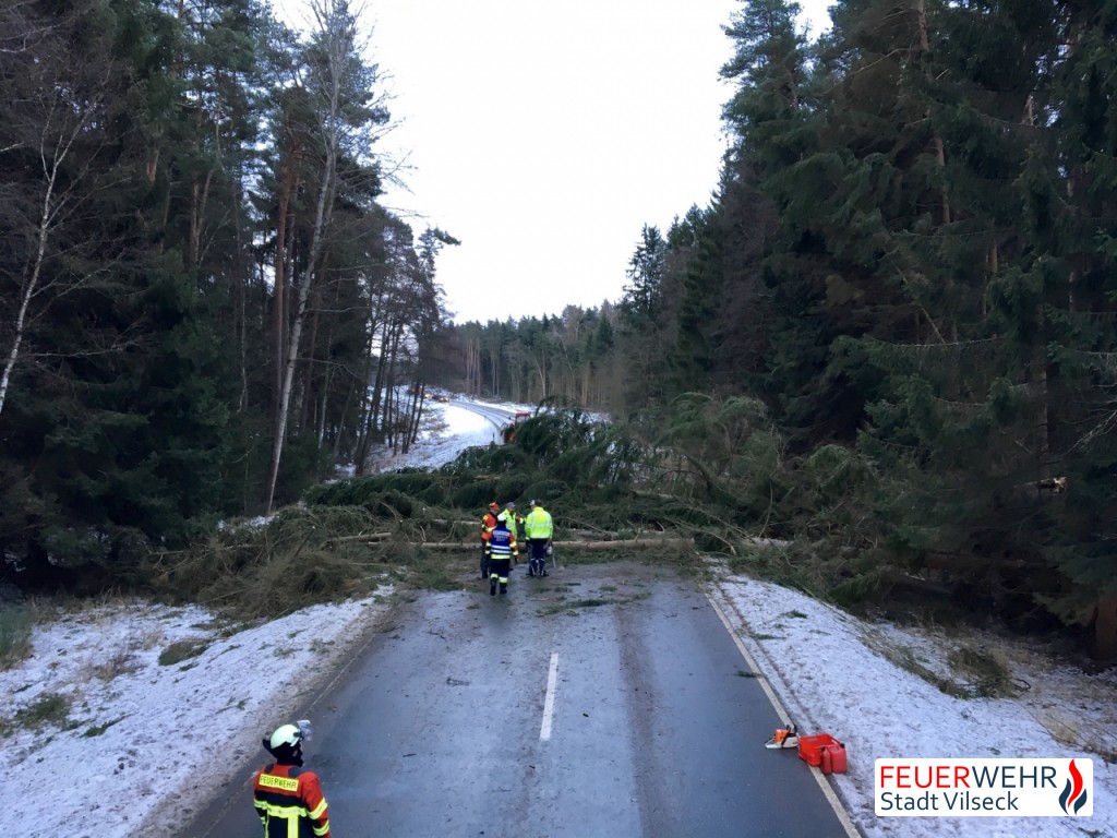 Um 7.21 Uhr wurde die Feuerwehr Vilseck zu einem gemeldeten Verkehrsunfall auf die St2166 Richtung Freihung alarmiert. Nachdem die Lenkerin des PKWs unverletzt war, konzentrierte sich die Aufgabe der Feuerwehr auf die Beseitigung eines massiven Baumes, welcher die komplette Fahrbahn blockierte.