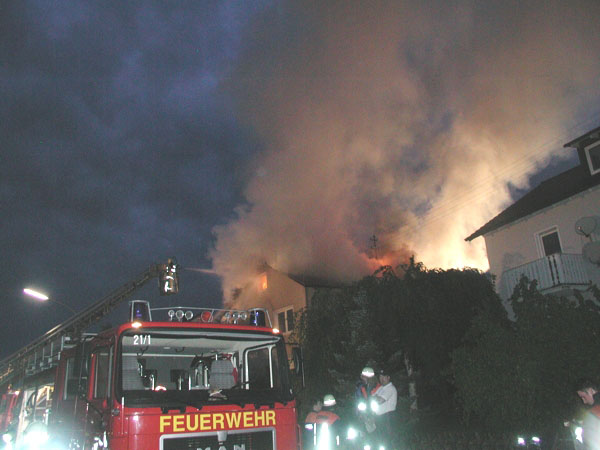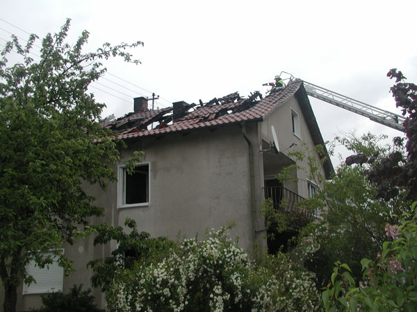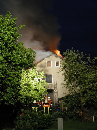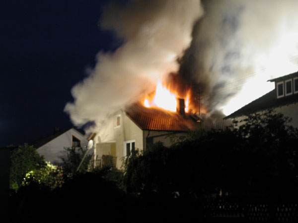 Da sich die Flammen jedoch bereits zu Beginn der ersten Löschmaßnahmen über die Holztreppe im gesamten Haus ausgebreitet hatten, musste ein Angriff über diesen Weg wieder angebrochen werden. Ein weiteres Vorgehen über die bereits stark abgebrannte Treppe war nicht mehr möglich. Auch mit einem zweiten Versuch über den Balkon im 1. Obergeschoss, war es nicht möglich einen Durchbrand ins Dachgeschoss zu verhindern. Begünstigt durch einen überwiegend aus Holz bestehenden Innenausbau konnte nicht verhindert werden, dass das Feuer schließlich auch den Dachstuhl erfasste und somit ein Innenangriff nicht mehr sicher durchgeführt werden konnte. Da zu diesem Zeitpunkt bereits von einem Totalschaden des Gebäudes ausgegangen werden musste, wurde der Innenangriff abgebrochen und versucht mit einer defensiven Taktik das Feuer von außen unter Kontrolle zu bringen.
