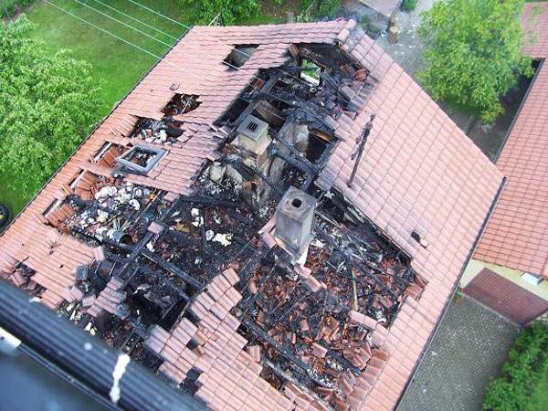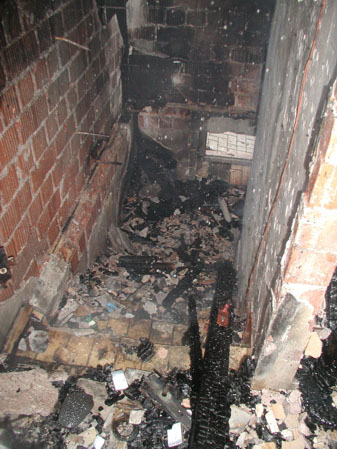 (links: Eingangsbereich im Erdgeschoss / rechts: abgebrannter Treppenraum zum
