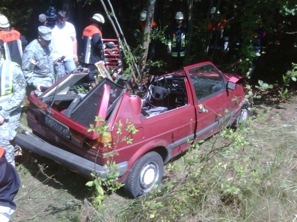 Ein PKW kaum aus bisher ungeklärter Ursache von der Straße ab, schleuderte in das angrenzende Waldstück, prallte gegen einen Baum und kam seitlich zum Liegen. Die Fahrerin wurde dabei eingeklemmt. Da die Schwere der Verletzungen zum gegebenen Zeitpunkt noch unklar war, wurde zusätzlich noch ein Rettungshubschrauber angefordert.